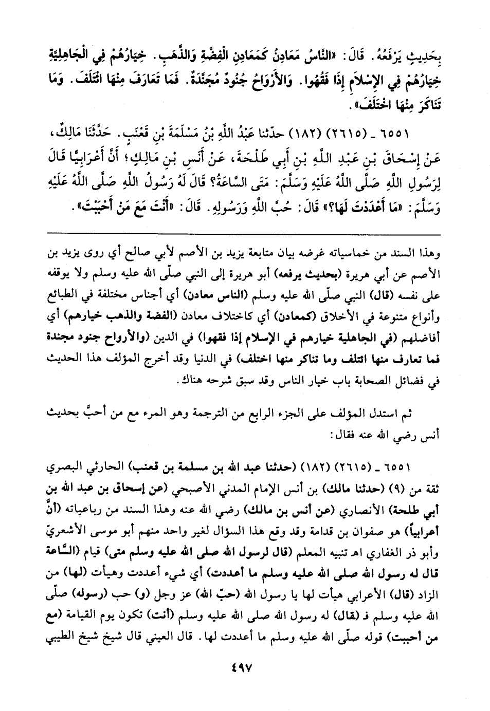 ٦٥٥١ - (٢٦١٥) (١٨٢) (حدثنا عبد الله بن مسلمة بن قعنب) الحارثي البصري ثقة من (٩) (حدثنا مالك) بن أنس الإِمام المدني الأصبحي (عن إسحاق بن عبد الله بن أبي طلحة) الأنصاري (عن أنس بن مالك) رضي الله عنه وهذا السند من رباعياته (أن أعرابيًّا) هو صفوان بن قدامة وقد وقع هذا السؤال لغير واحد منهم أبو موسى الأشعريّ وأبو ذر الغفاري اهـ تنبيه المعلم (قال لرسول الله صلى الله عليه وسلم متى) قيام (الساعة قال له رسول الله صلى الله عليه وسلم ما أعددت) أي شيء أعددت وهيأت (لها) من الزاد (قال) الأعرابي هيأت لها يا رسول الله (حبّ الله) عَزَّ وَجَلَّ (و) حب (رسوله) صلى الله عليه وسلم فـ (ـقال) له رسول الله صلى الله عليه وسلم (أنت) تكون يوم القيامة (مع من أحببت) قوله صلى الله عليه وسلم ما أعددت لها. قال العيني قال شيخ شيخ الطيبي