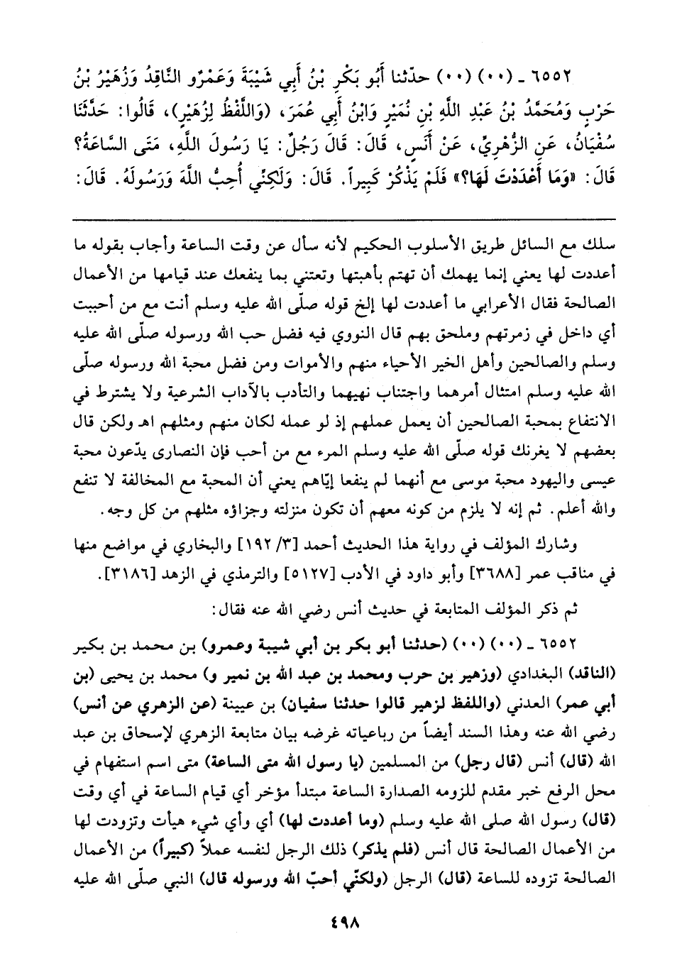 ٦٥٥٢ - (٠٠) (٠٠) (حدثنا أبو بكر بن أبي شيبة وعمرو) بن محمَّد بن بكير (الناقد) البغدادي (وزهير بن حرب ومحمد بن عبد الله بن نمير و) محمَّد بن يحيى (بن أبي عمر) العدني (واللفظ لزهير قالوا حدثنا سفيان) بن عيينة (عن الزهريّ عن أنس) رضي الله عنه وهذا السند أيضًا من رباعياته غرضه بيان متابعة الزهريّ لإسحاق بن عبد الله (قال) أنس (قال رجل) من المسلمين (يا رسول الله متى الساعة) متى اسم استفهام في محل الرفع خبر مقدم للزومه الصدارة الساعة مبتدأ مؤخر أي قيام الساعة في أي وقت (قال) رسول الله صلى الله عليه وسلم (وما أعددت لها) أي وأي شيء هيأت وتزودت لها من الأعمال الصالحة قال أنس (فلم يذكر) ذلك الرجل لنفسه عملًا (كبيرًا) من الأعمال الصالحة تزوده للساعة (قال) الرجل (ولكنّي أحبُّ الله ورسوله قال) النبي صلى الله عليه
