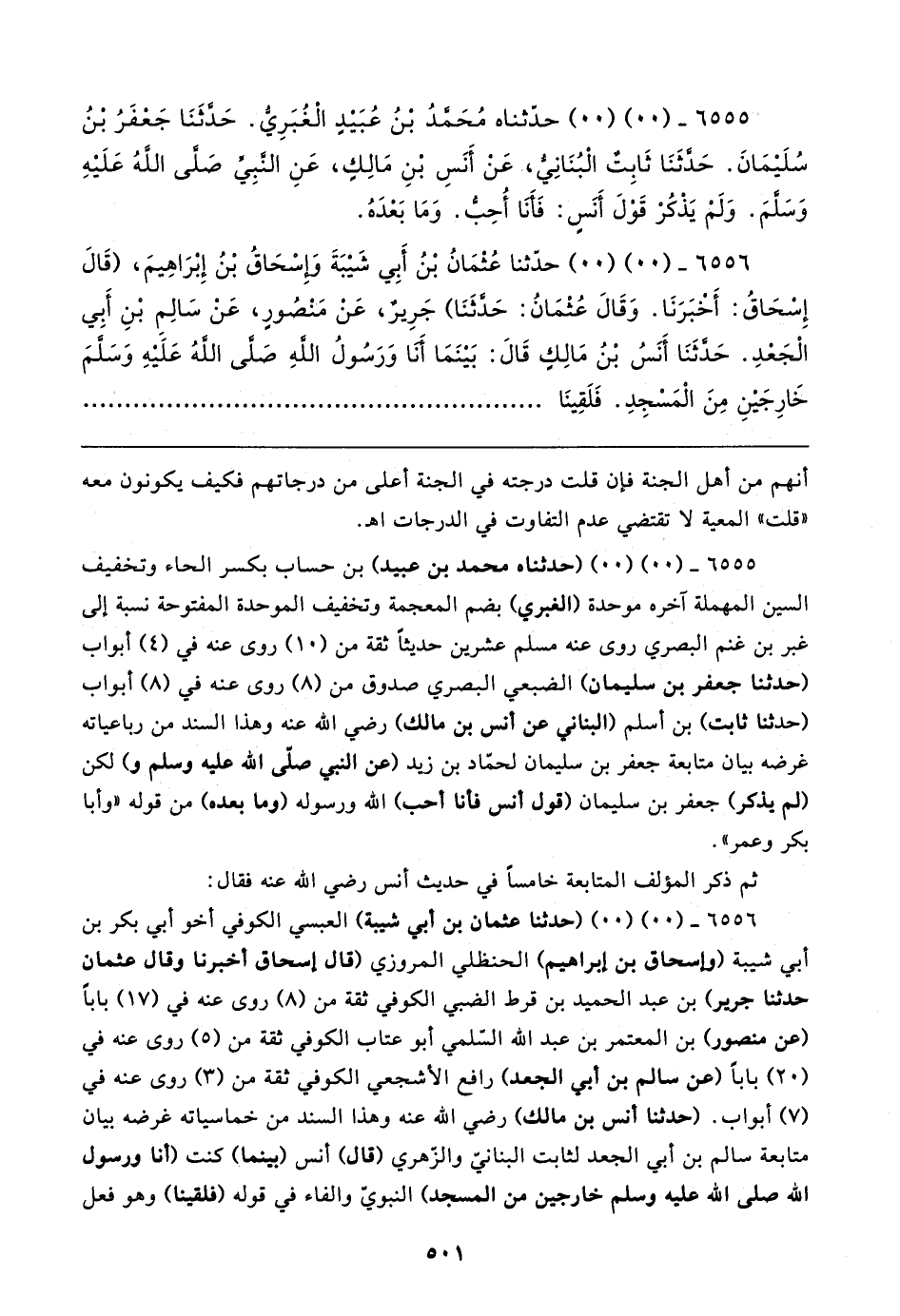 ٦٥٥٦ - (٠٠) (٠٠) حدثنا عُثْمَانُ بْنُ أبي شَيبَةَ وإِسْحَاقُ بْنُ إِبْرَاهِيمَ، (قَال إِسْحَاقُ: أَخبَرَنَا. وَقَال عُثْمَانُ: حَدَّثَنَا) جَرِيرٌ، عَنْ مَنْصُورٍ، عَنْ سَالِمِ بْنِ أَبِي الْجَعْدِ. حَدَّثَنَا أَنَسُ بْنُ مَالِكِ قَال: بَينَمَا أنَّا وَرَسُولُ الله صلى الله عَلَيهِ وَسلمَ خَارِجَينِ مِنَ الْمَسْجِدِ. فَلَقِينَا