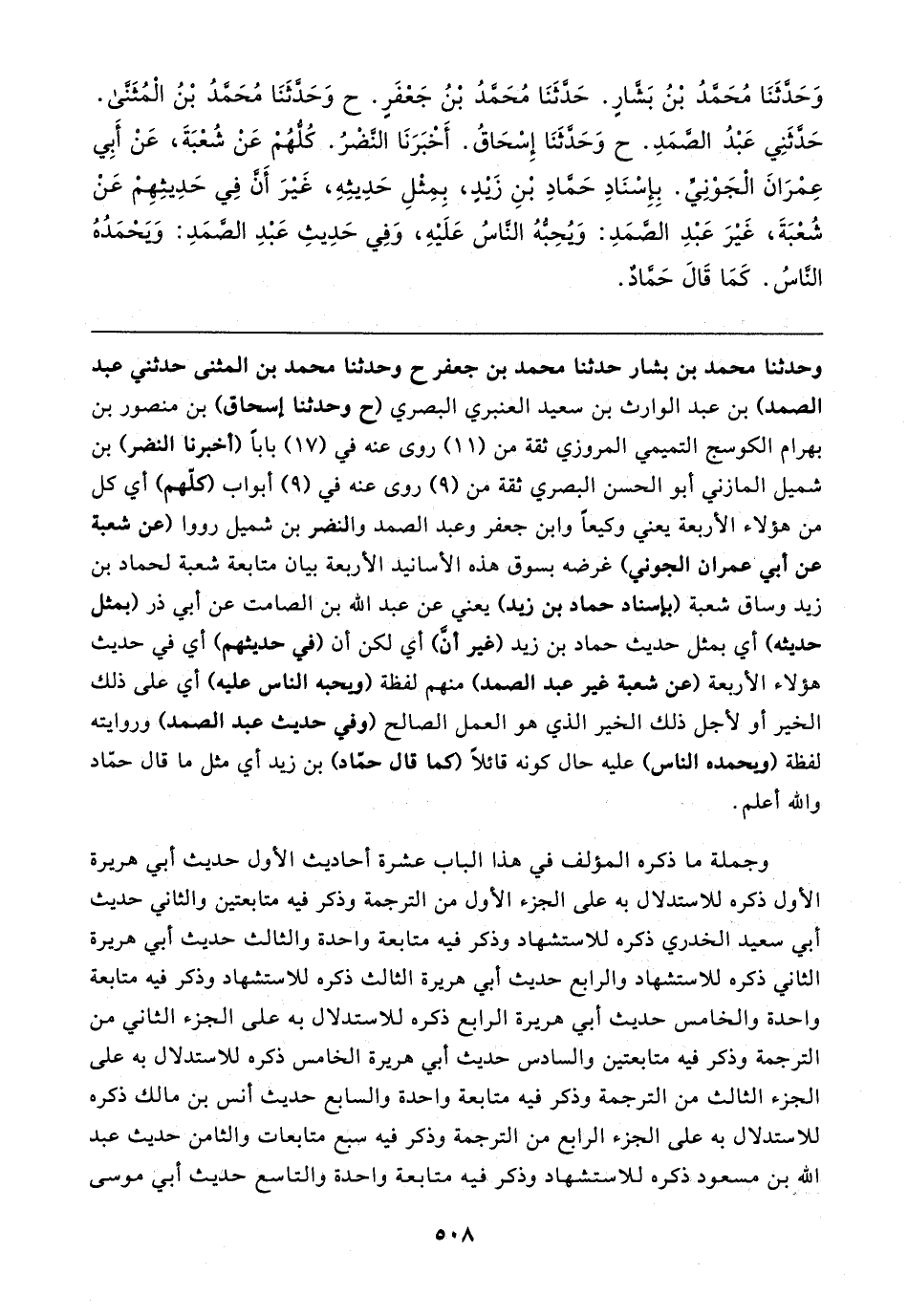 وَحَدَّثَنَا محمد بْنُ بَشَّارٍ. حَدَّثَنَا محمد بْنُ جَعْفَرٍ. ح وَحَدَّثَنَا محمد بْنُ الْمُثَنَّى. حَدثني عَبْدُ الصَّمَدِ. ح وَحَدَّثَنَا إِسْحَاقُ. أَخبَرَنَا النَّضْرُ. كُلهمْ عَنْ شُعْبَةَ، عَنْ أَبِي عِمْرَانَ الْجَوْنِيِّ. بِإِسْنَادِ حمّادِ بْنِ زيدٍ، بِمِثْلِ حَدِيثِهِ، غَيرَ أَن في حَدِيثِهِمْ عَنْ شُعْبَةَ، غَيرَ عَبْدِ الصَّمَدِ: ويحِبُّهُ النَّاسُ عَلَيهِ، وَفِي حَدِيثِ عَبْدِ الصَّمَدِ: وَيحْمَدُهُ النَّاسُ. كَمَا قَال حَمَّادٌ