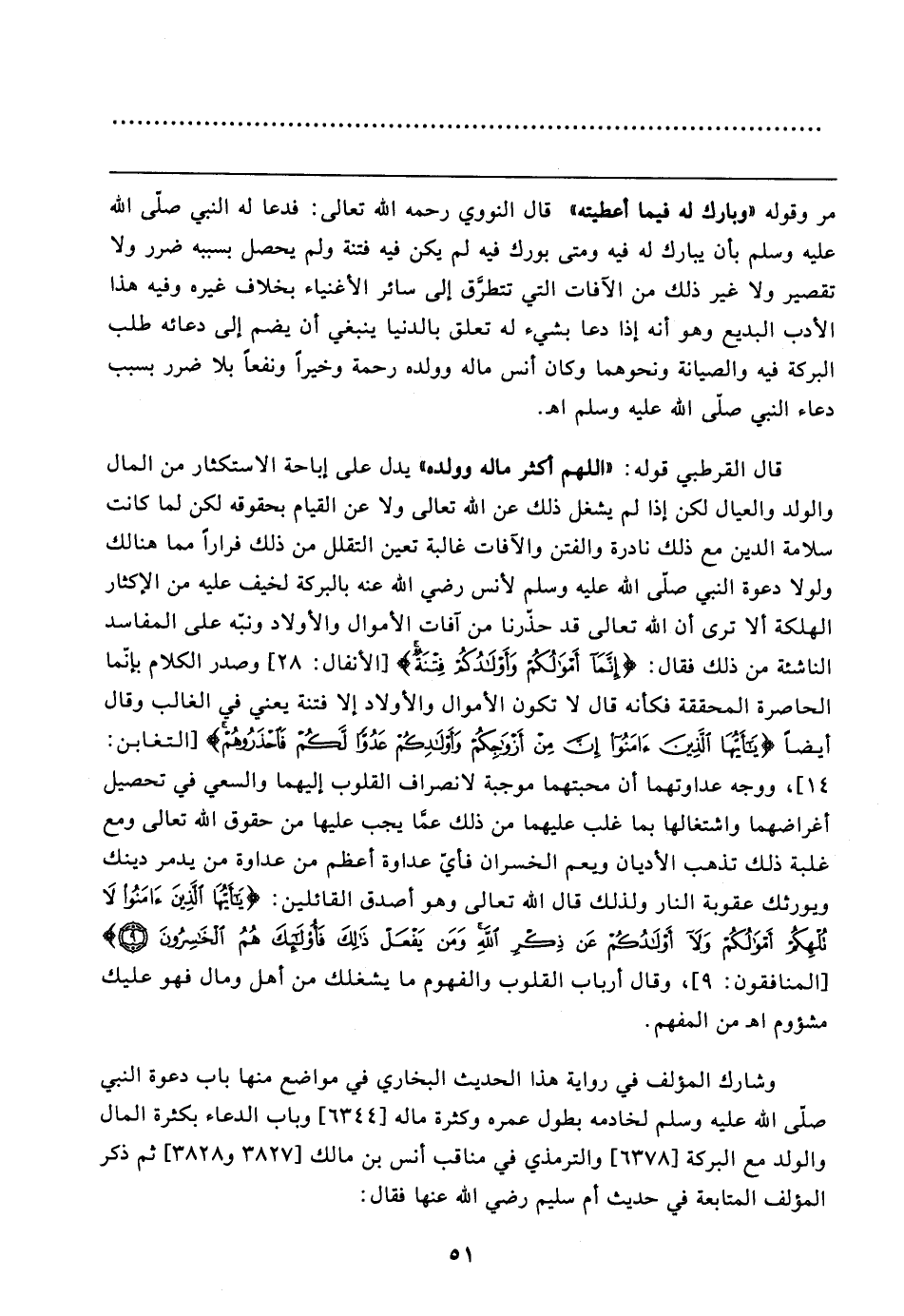 قال القرطبي قوله: "اللهم أكثر ماله وولده" يدل على إباحة الاستكثار من المال والولد والعيال لكن إذا لم يشغل ذلك عن الله تعالى ولا عن القيام بحقوقه لكن لما كانت سلامة الدين مع ذلك نادرة والفتن والآفات غالبة تعين التقلل من ذلك فرارًا مما هنالك ولولا دعوة النبي صلَّى الله عليه وسليم لأنس رضي الله عنه بالبركة لخيف عليه من الإكثار الهلكة ألا ترى أن الله تعالى قد حذّرنا من آفات الأموال والأولاد ونبّه على المفاسد الناشئة من ذلك فقال: {إِنَّمَا أَمْوَالُكُمْ وَأَوْلَادُكُمْ فِتْنَةٌ} [الأنفال: ٢٨] وصدر الكلام بإنّما الحاصرة المحققة فكأنه قال لا تكون الأموال والأولاد إلا فتنة يعني في الغالب وقال أيضًا {يَا أَيُّهَا الَّذِينَ آمَنُوا إِنَّ مِنْ أَزْوَاجِكُمْ وَأَوْلَادِكُمْ عَدُوًّا لَكُمْ فَاحْذَرُوهُمْ} [التغابن: ١٤]، ووجه عداوتهما أن محبتهما موجبة لانصراف القلوب إليهما والسعي في تحصيل أغراضهما واشتغالها بما غلب عليهما من ذلك عمَّا يجب عليها من حقوق الله تعالى ومع غلبة ذلك تذهب الأديان ويعم الخسران فأيّ عداوة أعظم من عداوة من يدمر دينك ويورثك عقوبة النار ولذلك قال الله تعالى وهو أصدق القائلين: {يَا أَيُّهَا الَّذِينَ آمَنُوا لَا تُلْهِكُمْ أَمْوَالُكُمْ وَلَا أَوْلَادُكُمْ عَنْ ذِكْرِ اللَّهِ وَمَنْ يَفْعَلْ ذَلِكَ فَأُولَئِكَ هُمُ الْخَاسِرُونَ (٩)} [المنافقون: ٩]، وقال أرباب القلوب والفهوم ما يشغلك من أهل ومال فهو عليك مشؤوم اهـ من المفهم.