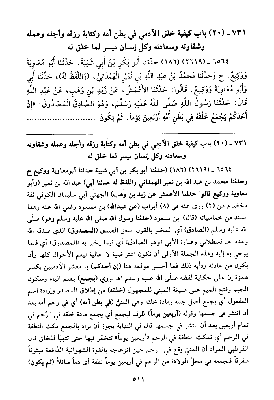 ٦٥٦٤ - (٢٦١٩) (١٨٦) حدثنا أَبُو بَكْرِ بْنُ أَبِي شَيبَةَ. حَدَّثَنَا أَبُو مُعَاويةَ وَوَكِيعٌ. ح وَحَدَّثَنَا محمد بْنُ عَبْدِ الله بْنِ نُمَيرٍ الْهَمْدَانِيُّ، (وَاللَّفْظُ لَهُ)، حَدَّثَنَا أَبِي وَأَبُو مُعَاويةَ وَوَكِيعٌ. قَالُوا: حَدَّثَنَا الأَعْمَشُ، عَنْ زيدِ بْنِ وَهْبٍ، عَنْ عَبْدِ الله قَال: حَدَّثَنَا رَسُولُ الله صلى الله عَلَيهِ وَسلمَ، وَهُوَ الصَّادِقُ المَصْدُوقُ: "إِن أَحَدَكُمْ يُجْمَعُ خَلْقُهُ في بَطْنِ أُمِّهِ أَرْبَعِينَ يَوْمًا. ثُمَّ يَكُونُ