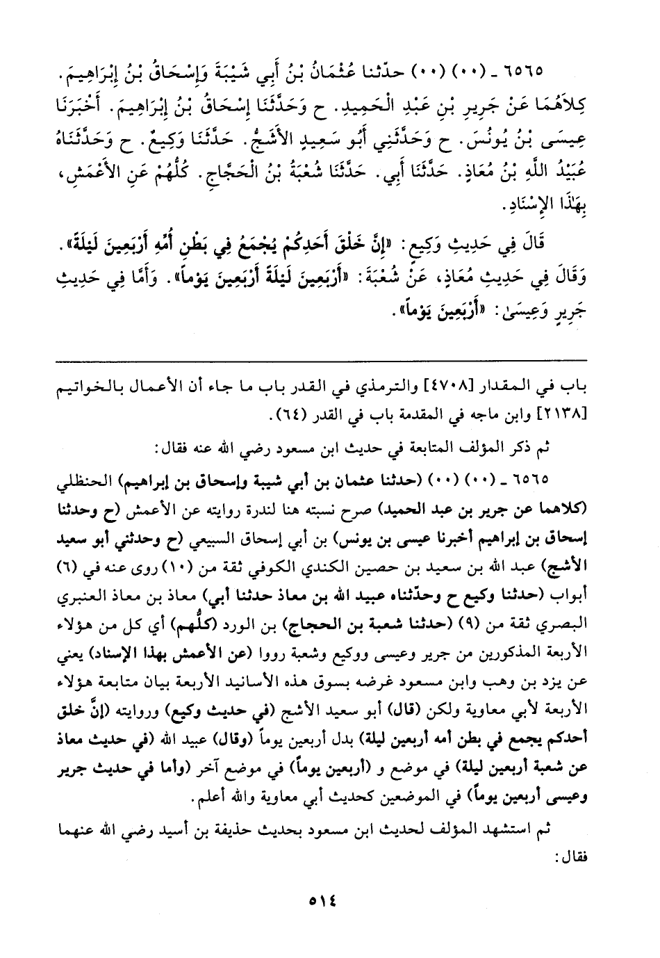 قَال في حَدِيثِ وَكِيعٍ: "إِن خَلْقَ أَحَدِكُمْ يُجْمَعُ في بَطْنِ أُمِّهِ أَرْبَعِينَ لَيلَةً". وَقَال في حَدِيثِ مُعَاذٍ، عَنْ شُعْبَةَ: "أَرْبَعِينَ لَيلَةً أَرْبَعِينَ يَوْمًا". وَأَمَّا في حَدِيثِ جَرِيرٍ وَعِيسَى: "أَرْبَعِينَ يَوْمًا"