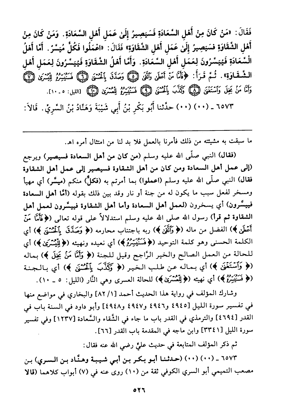فَقَال: "مَنْ كَانَ مِنْ أَهلِ السَّعَادَةِ فَسَيَصِيرُ إلى عَمَلِ أَهلِ السَّعَادَةِ. وَمَنْ كَانَ من أَهْلِ الشقَاوَةِ فسَيَصِيرُ إلى عَمَلِ أَهْلِ الشَّقَاوَةِ" فَقَال: "اعمَلُوا فَكُل مُيَسَّرٌ. أما أَهْلُ الْسَّعَادَةِ فَيُيَسَّرُونَ لِعَمَلِ أَهلِ السَّعَادَةِ. وَأما أَهْلُ الشَّقَاوَةِ فَيُيَسَّرُونَ لِعَمَلِ أَهلِ الشَّقَاوَةِ". ثُمَّ قَرَأَ: {فَأَمَّا مَنْ أَعْطَى وَاتَّقَى (٥) وَصَدَّقَ بِالْحُسْنَى (٦) فَسَنُيَسِّرُهُ لِلْيُسْرَى (٧) وَأَمَّا مَنْ بَخِلَ وَاسْتَغْنَى (٨) وَكَذَّبَ بِالْحُسْنَى (٩) فَسَنُيَسِّرُهُ لِلْعُسْرَى (١٠)} [الليل: ٥ - ١٠].
