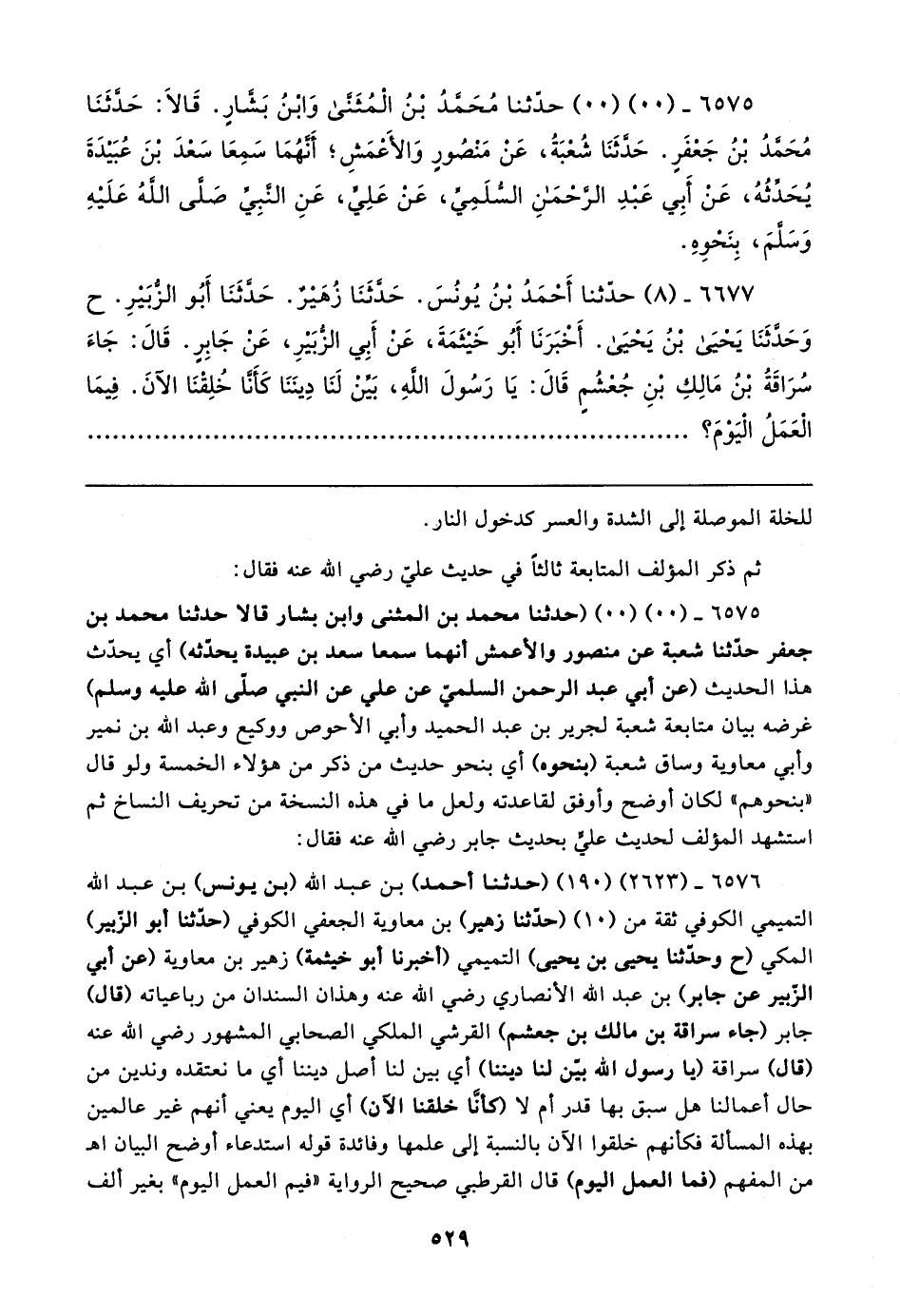 ٦٥٧٥ - (٠٠) (٠٠) (حدثنا محمَّد بن المثنى وابن بشار قالا حدثنا محمَّد بن جعفر حدثنا شعبة عن منصور والأعمش أنهما سمعا سعد بن عبيدة يحدثه) أي يحدّث هذا الحديث (عن أبو عبد الرحمن السلميّ عن علي عن النبي صلى الله عليه وسلم) غرضه بيان متابعة شعبة لجرير بن عبد الحميد وأبي الأحوص ووكيع وعبد الله بن نمير وأبي معاوية وساق شعبة (بنحوه) أي بنحو حديث من ذكر من هؤلاء الخمسة ولو قال "بنحوهم" لكان أوضح وأوفق لقاعدته ولعل ما في هذه النسخة من تحريف النساخ ثم استشهد المؤلف لحديث على بحديث جابر رضي الله عنه فقال: