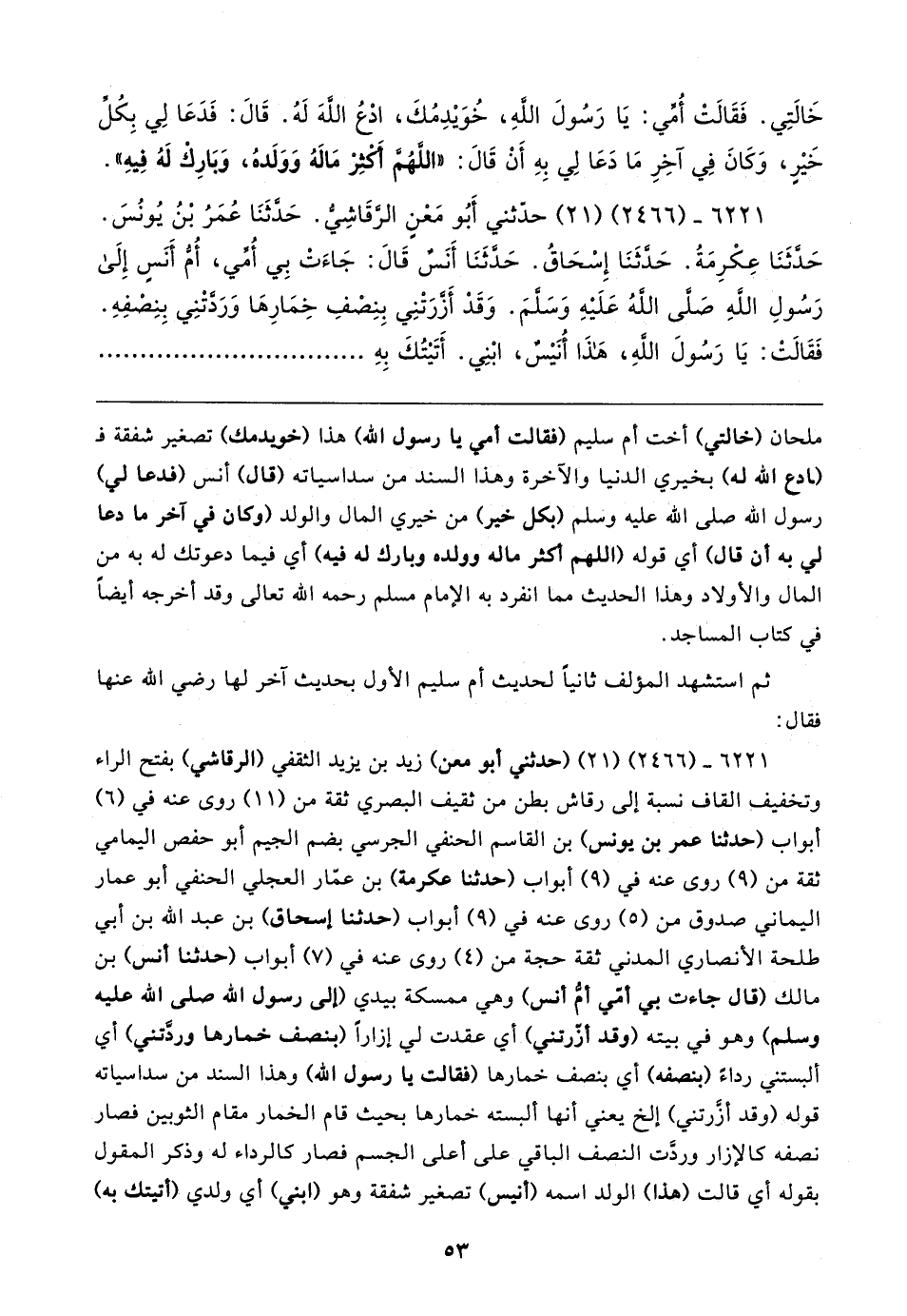 ٦٢٢١ - (٢٤٦٦) (٢١) (حدثني أبو معن) زيد بن يزيد الثقفي (الرقاشي) بفتح الراء وتخفيف القاف نسبة إلى رقاش بطن من ثقيف البصري ثقة من (١١) روى عنه في (٦) أبواب (حدثنا عمر بن يونس) بن القاسم الحنفي الجرسي بضم الجيم أبو حفص اليمامي ثقة من (٩) روى عنه في (٩) أبواب (حدثنا عكرمة) بن عمّار العجلي الحنفي أبو عمار اليماني صدوق من (٥) روى عنه في (٩) أبواب (حدثنا إسحاق) بن عبد الله بن أبي طلحة الأنصاري المدني ثقة حجة من (٤) روى عنه في (٧) أبواب (حدثنا أنس) بن مالك (قال جاءت بي أمّي أمُّ أنس) وهي ممسكة بيدي (إلى رسول الله صلى الله عليه وسلم) وهو في بيته (وقد أزّرتني) أي عقدت لي إزارًا (بنصف خمارها وردَّتني) أي ألبستني رداءً (بنصفه) أي بنصف خمارها (فقالت يا رسول الله) وهذا السند من سداسياته قوله (وقد أزَّرتني) إلخ يعني أنها ألبسته خمارها بحيث قام الخمار مقام الثوبين فصار نصفه كالإزار وردَّت النصف الباقي على أعلى الجسم فصار كالرداء له وذكر المقول بقوله أي قالت (هذا) الولد اسمه (أنيس) تصغير شفقة وهو (ابني) أي ولدي (أتيتك به)