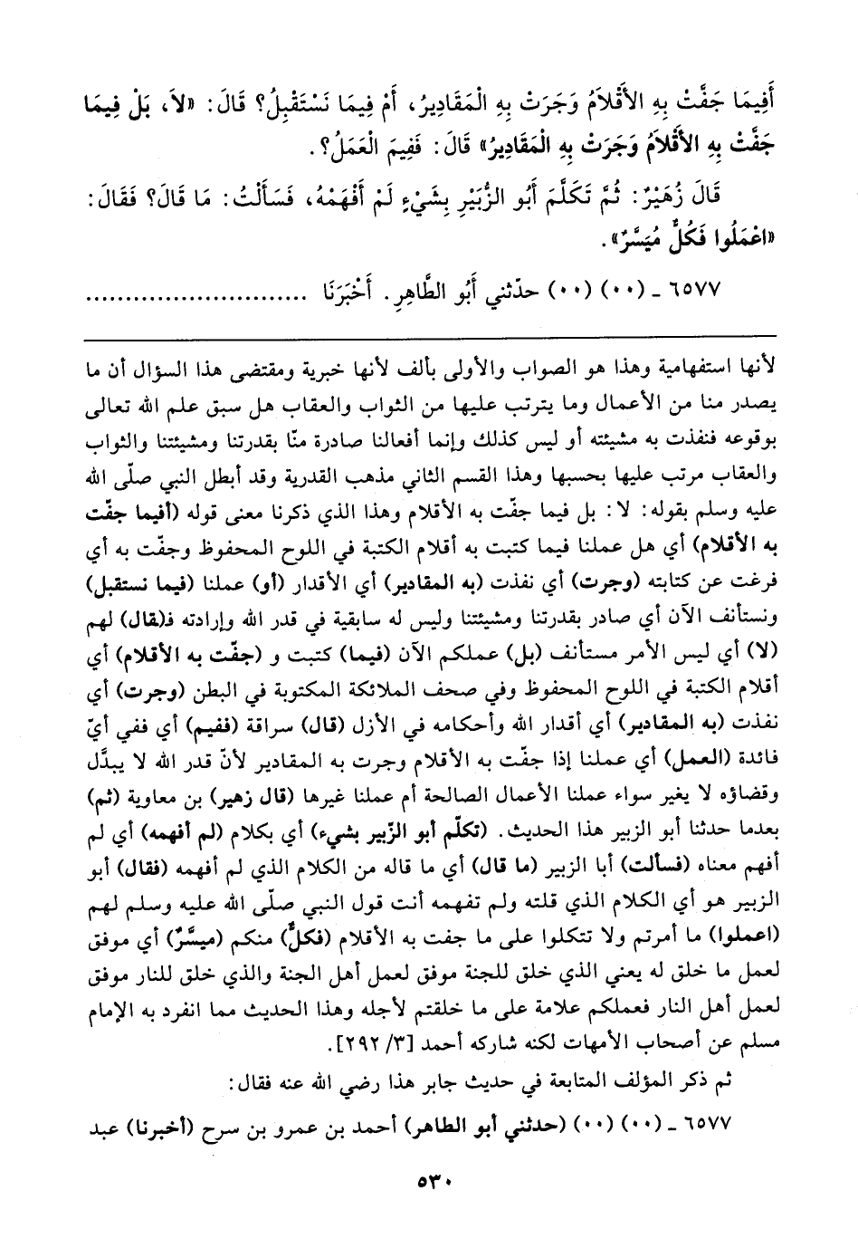 أَفِيمَا جَفَّت بِهِ الأَقْلامُ وَجَرَت بِهِ الْمَقَادِيرُ، أمْ فِيمَا نَستقْبِلُ؟ قَال: "لَا، بَلْ فِيمَا جَفَّتْ بِهِ الأَقْلامُ وَجَرَتْ بِهِ الْمَقَادِيرُ" قَال: فَفِيمَ الْعَمَلُ؟ .
