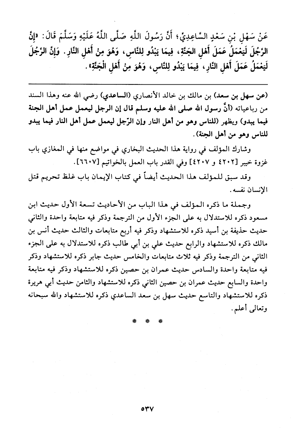 عَنْ سَهْلٍ بْنِ سَعْدٍ السَاعِدِيُّ؛ أَن رَسُولَ الله صلى الله عَلَيهِ وَسلمَ قَال: "إِن الرجُلَ لَيَعْمَلُ عَمَلَ أَهلِ الجَنَّةِ، فِيمَا يَبدُو لِلنَّاسِ، وَهُوَ مِنْ أَهْلِ النَّارِ. وَإِن الرجُلَ لَيَعْمَلُ عَمَلَ أَهْلِ النَّارِ، فِيمَا يَبدُو لِلناسِ، وَهُوَ مِنْ أَهْلِ الْجَنَّةِ"