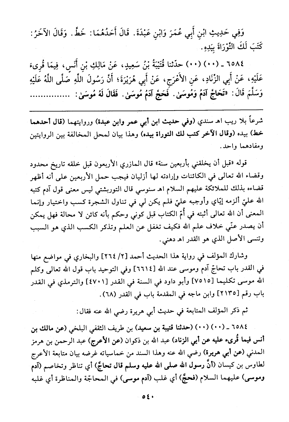 ٦٥٨٤ - (٠٠) (٠٠) حدثنا قُتَيبَةُ بْنُ سَعِيدٍ، عَنْ مَالِكِ بْنِ أَنَسٍ، فِيمَا قُرِئَ عَلَيهِ، عَنْ أبِي الزِّنَادِ، عَنِ الأَعْرَجِ، عَنْ أَبِي هُرَيرَةَ؛ أَن رَسُولَ الله صلى الله عَلَيهِ وَسلمَ قَال: "تَحَاجَّ آدَمُ وَمُوسَى. فَحَج آدم مُوسَى. فَقَال لَهُ مُوسَى: