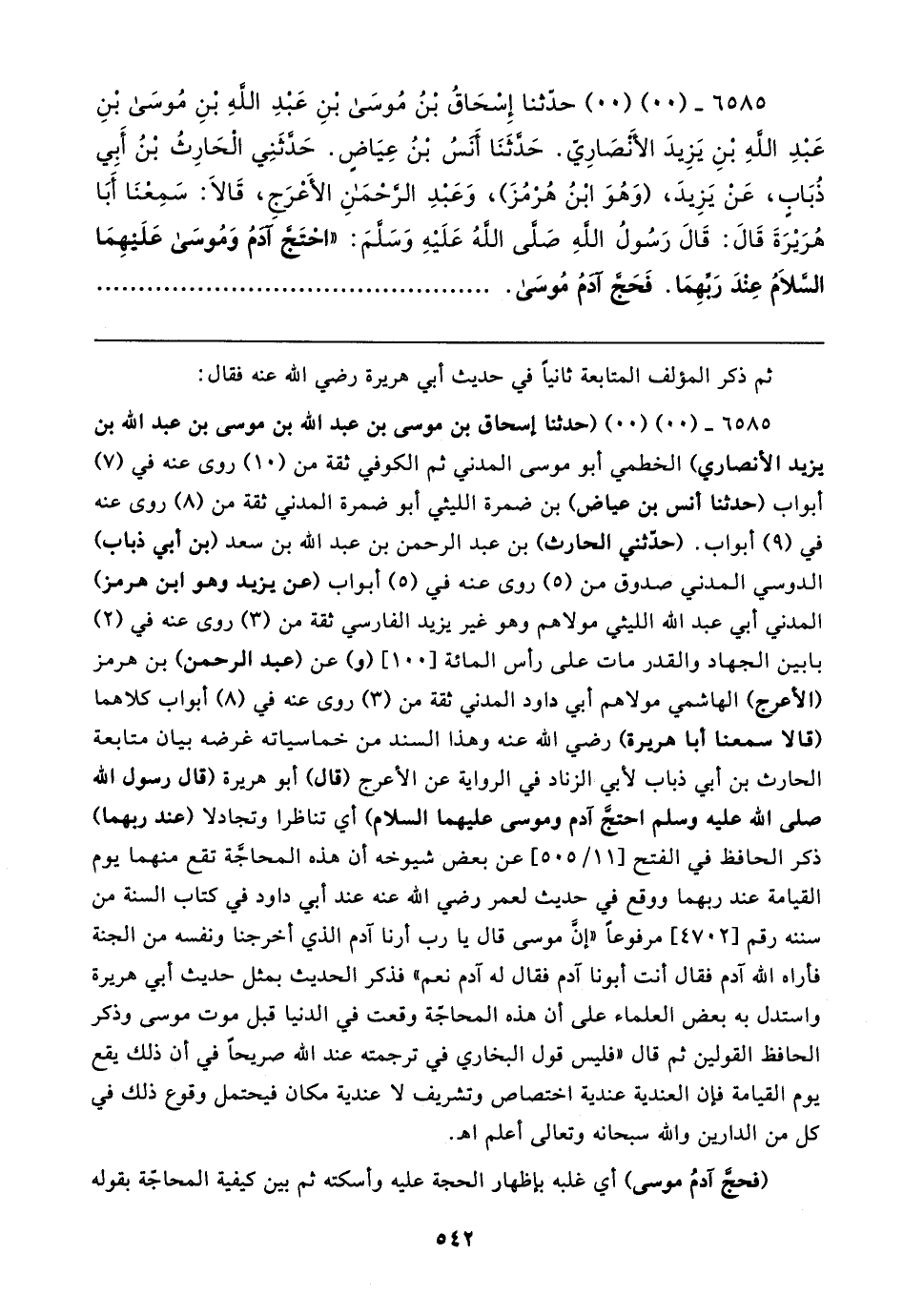 ٦٥٨٥ - (٠٠) (٠٠) (حدثنا إسحاق بن موسى بن عبد الله بن موسى بن عبد الله بن يزيد الأنصاري) الخطمي أبو موسى المدني ثم الكوفي ثقة من (١٠) روى عنه في (٧) أبواب (حدثنا أنس بن عياض) بن ضمرة الليثي أبو ضمرة المدني ثقة من (٨) روى عنه في (٩) أبواب. (حدّثني الحارث) بن عبد الرحمن بن عبد الله بن سعد (بن أبي ذباب) الدوسي المدني صدوق من (٥) روى عنه في (٥) أبواب (عن يزيد وهو ابن هرمز) المدني أبي عبد الله الليثي مولاهم وهو غير يزيد الفارسي ثقة من (٣) روى عنه في (٢) بابين الجهاد والقدر مات على رأس المائة [١٠٠] (و) عن (عبد الرحمن) بن هرمز (الأعرج) الهاشمي مولاهم أبي داود المدني ثقة من (٣) روى عنه في (٨) أبواب كلاهما (قالا سمعنا أبا هريرة) رضي الله عنه وهذا السند من خماسياته غرضه بيان متابعة الحارث بن أبي ذباب لأبي الزناد في الرواية عن الأعرج (قال) أبو هريرة (قال رسول الله صلى الله عليه وسلم احتجَّ آدم وموسى عليهما السلام) أي تناظرا وتجادلا (عند ريهما) ذكر الحافظ في الفتح [١١/ ٥٠٥] عن بعض شيوخه أن هذه المحاجَّة تقع منهما يوم القيامة عند ربهما ووقع في حديث لعمر رضي الله عنه عند أبي داود في كتاب السنة من سننه رقم [٤٧٠٢] مرفوعًا "إنَّ موسى قال يا رب أرنا آدم الذي أخرجنا ونفسه من الجنة فأراه الله آدم فقال أنت أبونا آدم فقال له آدم نعم" فذكر الحديث بمثل حديث أبي هريرة واستدل به بعض العلماء على أن هذه المحاجّة وقعت في الدنيا قبل موت موسى وذكر الحافظ القولين ثم قال "فليس قول البخاري في ترجمته عند الله صريحًا في أن ذلك يقع يوم القيامة فإن العندية عندية اختصاص وتشريف لا عندية مكان فيحتمل وقوع ذلك في كل من الدارين والله سبحانه وتعالى أعلم اهـ.