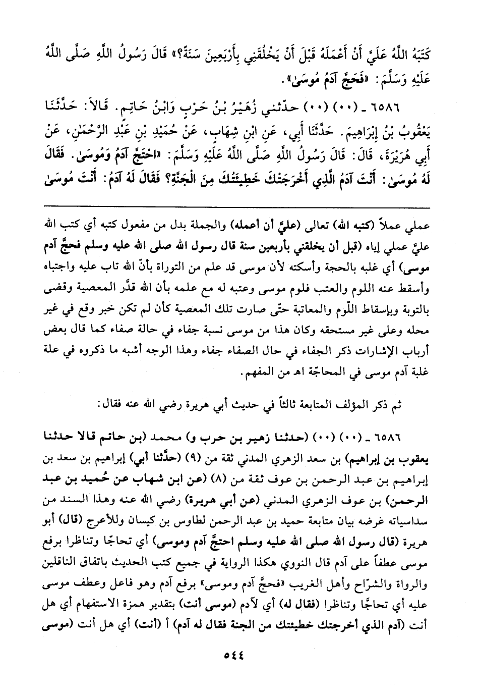٦٥٨٦ - (٠٠) (٠٠) حدّثني زُهَيرُ بْنُ حَرْبٍ وَابْنُ حَاتِمٍ. قَالا: حَدَّثَنَا يَعْقُوبُ بْنُ إِبْرَاهِيمَ. حَدَّثَنَا أَبِي، عَنِ ابْنِ شِهَابٍ، عَنْ حُمَيدِ بْنِ عَبدِ الرَّحْمَنِ، عَنْ أَبِي هُرَيرَةَ، قَال: قَال رَسُولُ الله صلى الله عَلَيهِ وَسلمَ: ؛ احتجَّ آدمُ وَمُوسَى. فَقَال لَهُ مُوسَى: أنتَ آدَمُ الذِي أَخْرَجَتْكَ خَطِيئَتُكَ مِنَ الْجَنَّةِ؟ فَقَال لَهُ آدَمُ: أَنتَ مُوسَى