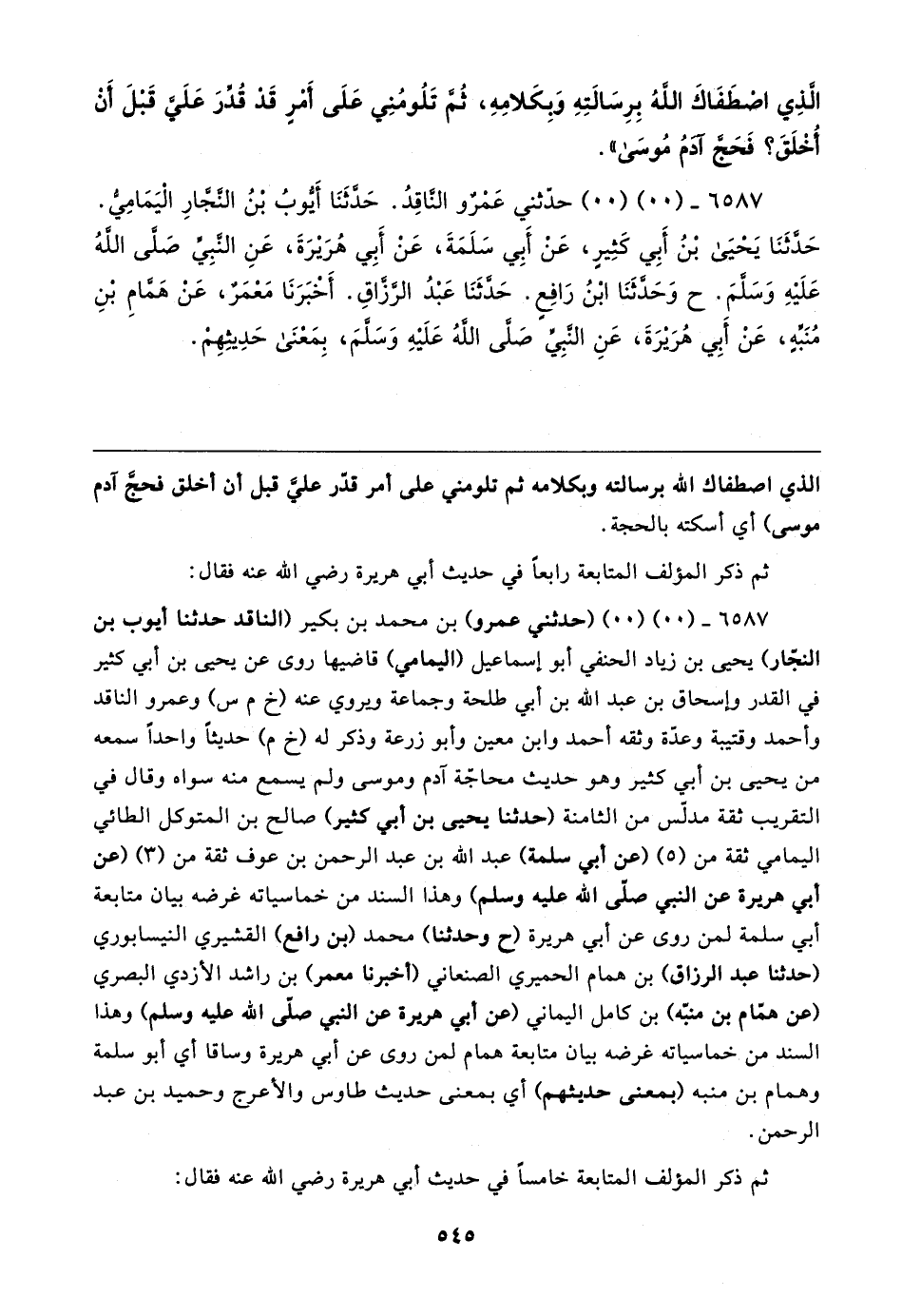 الذِي اصْطَفَاكَ الله بِرِسَالتِهِ وَبِكَلامِهِ، ثُمَّ تَلُومُنِي عَلَى أَمْرٍ قَدْ قُدِّرَ عَلَيَّ قَبلَ أَنْ أُخْلَقَ؟ فَحَج آدمُ مُوسَى".