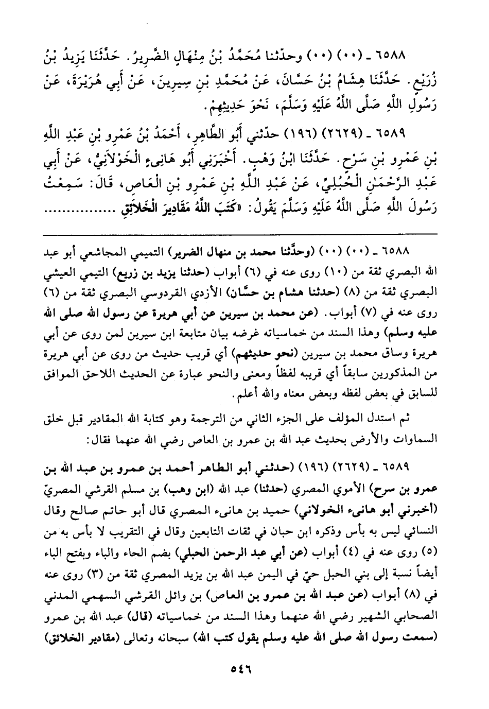 ٦٥٨٩ - (٢٦٢٩) (١٩٦) (حدثني أبو الطاهر أحمد بن عمرو بن عبد الله بن عمرو بن سرح) الأموي المصري (حدثنا) عبد الله (ابن وهب) بن مسلم القرشي المصريّ (أخبرني أبو هانئ الخولاني) حميد بن هانئ المصري قال أبو حاتم صالح وقال النسائي ليس به بأس وذكره ابن حبان في ثقات التابعين وقال في التقريب لا بأس به من (٥) روى عنه في (٤) أبواب (عن أبي عبد الرحمن الحبلي) بضم الحاء والباء وبفتح الباء أيضًا نسبة إلى بني الحبل حتى في اليمن عبد الله بن يزيد المصري ثقة من (٣) روى عنه في (٨) أبواب (عن عبد الله بن عمرو بن العاص) بن وائل القرشي السهمي المدني الصحابي الشهير رضي الله عنهما وهذا السند من خماسياته (قال) عبد الله بن عمرو (سمعت رسول الله صلى الله عليه وسلم يقول كتب الله) سبحانه وتعالى (مقادير الخلائق)