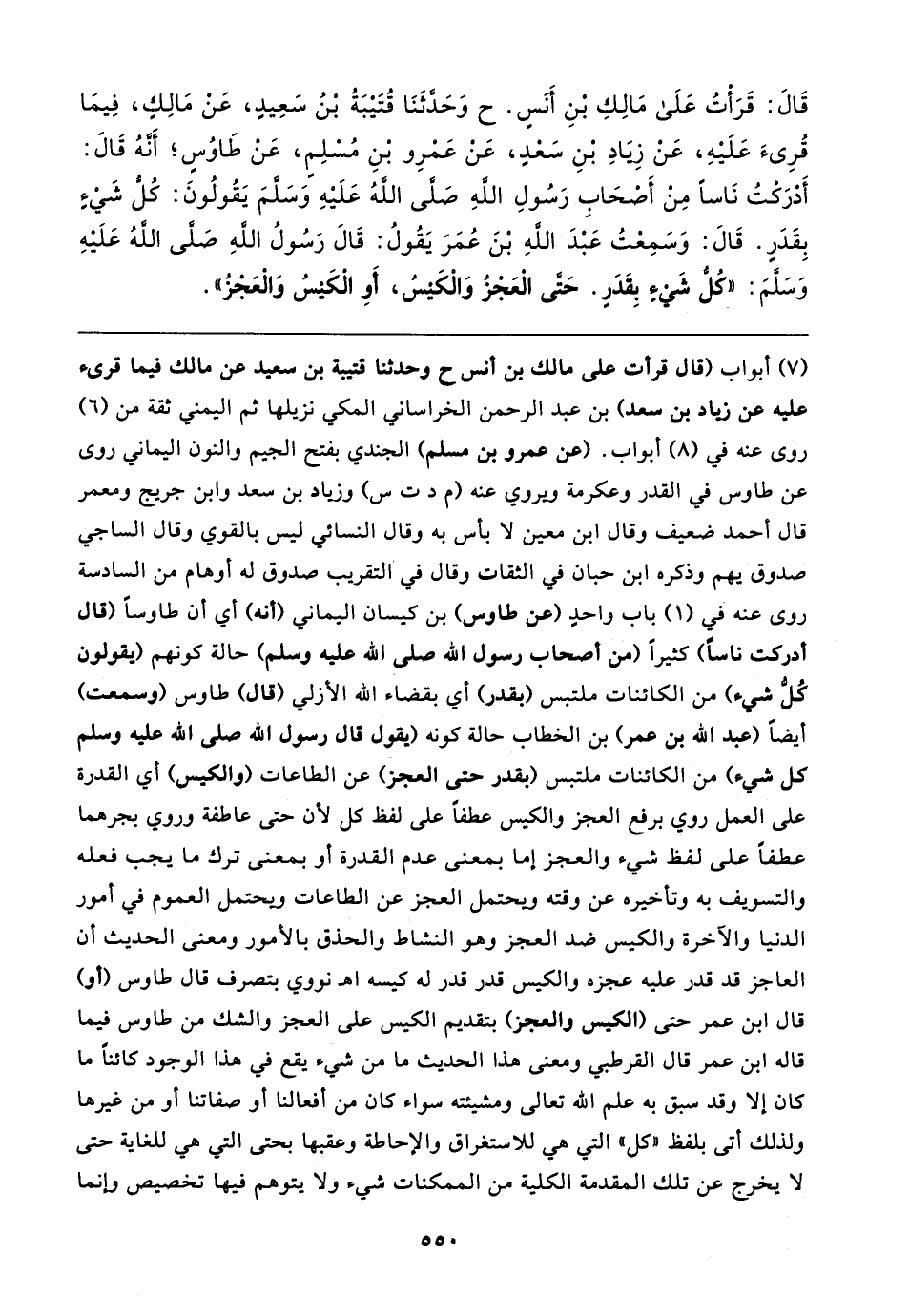 قَال: قَرَأْتُ عَلَى مَالِكِ بْنِ أَنَسٍ. ح وَحَدَّثَنَا قُتَيبَةُ بْنُ سَعِيدٍ، عَنْ مَالِكٍ، فِيمَا قُرِئَ عَلَيهِ، عَنْ زِيادِ بْنِ سَعْدٍ، عَنْ عَمْرِو بْنِ مُسْلِمٍ، عَنْ طَاوُسٍ؛ أَنَّهُ قَال: أَدْرَكْتُ نَاسًا من أَصْحَابِ رَسُولِ الله صلى الله عَلَيهِ وَسلمَ يَقُولُونَ: كُل شَيءٍ بِقَدَرٍ. قَال: وَسَمِعْتُ عَبْدَ الله بْنَ عُمَرَ يَقُولُ: قَال رَسُولُ الله صلى الله عَلَيهِ وسلَّمَ: "كُل شَيءٍ بِقَدَرٍ. حَتَّى العَجْزُ وَالْكَيسُ، أَو الكَيسُ وَالعَجزُ"