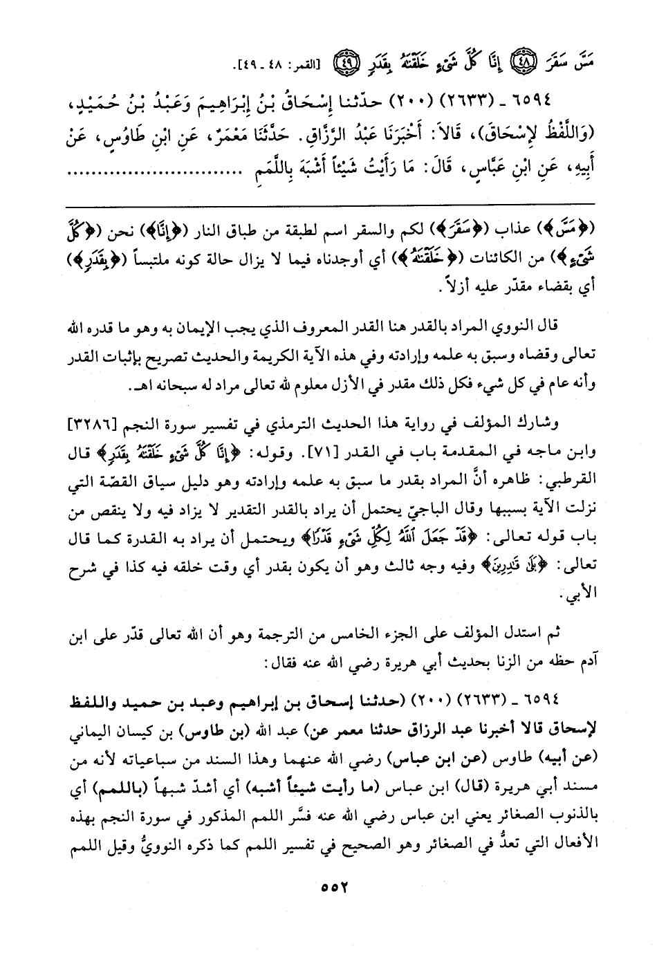 وشارك المؤلف في رواية هذا الحديث الترمذي في تفسير سورة النجم [٣٢٨٦] وابن ماجه في المقدمة باب في القدر [٧١]. وقوله: {إِنَّا كُلَّ شَيءٍ خَلَقْنَاهُ بِقَدَرٍ} قال القرطبي: ظاهره أن المراد بقدر ما سبق به علمه وارادته وهو دليل سياق القصّة التي نزلت الآية بسببها وقال الباجيّ يحتمل أن يراد بالقدر التقدير لا يزاد فيه ولا ينقص من باب قوله تعالى: {قَدْ جَعَلَ اللَّهُ لِكُلِّ شَيءٍ قَدْرًا} ويحتمل أن يراد به القدرة كما قال تعالى: {بَلَى قَادِرِينَ} وفيه وجه ثالث وهو أن يكون بقدر أي وقت خلقه فيه كذا في شرح الأبي.