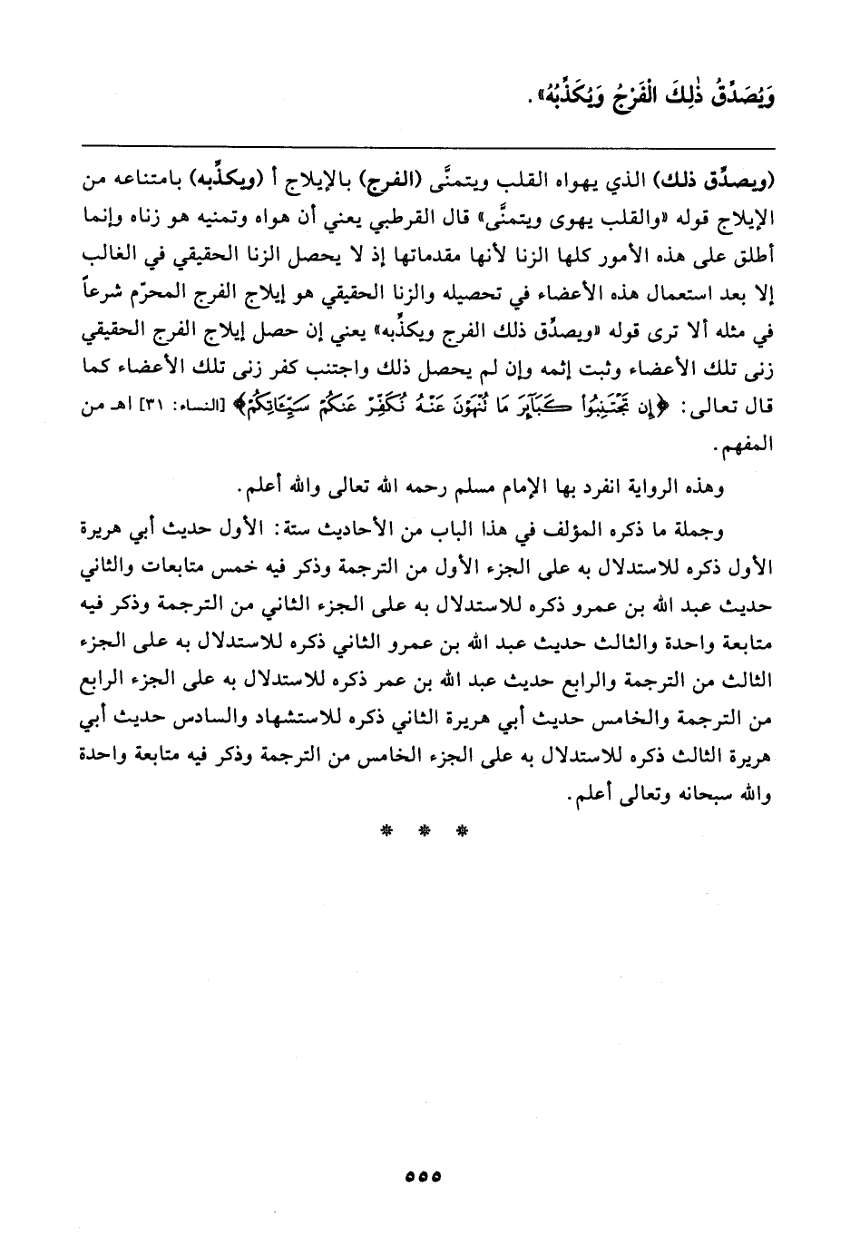 (ويصدِّق ذلك) الذي يهواه القلب ويتمنَّى (الفرج) بالإيلاج أ (ويكذِّبه) بامتناعه من الإيلاج قوله "والقلب يهوى ويتمنَّى" قال القرطبي يعني أن هواه وتمنيه هو زناه وإنما أطلق على هذه الأمور كلها الزنا لأنها مقدماتها إذ لا يحصل الزنا الحقيقي في الغالب إلا بعد استعمال هذه الأعضاء في تحصيله والزنا الحقيقي هو إيلاج الفرج المحرم شرعًا في مثله ألا ترى قوله "ويصدق ذلك الفرج ويكذبه" يعني إن حصل إيلاج الفرج الحقيقي زنى تلك الأعضاء وثبت إثمه وإن لم يحصل ذلك واجتنب كفر زنى تلك الأعضاء كما قال تعالى: {إِنْ تَجْتَنِبُوا كَبَائِرَ مَا تُنْهَوْنَ عَنْهُ نُكَفِّرْ عَنْكُمْ سَيِّئَاتِكُمْ} [النساء: ٣١] اهـ من المفهم.