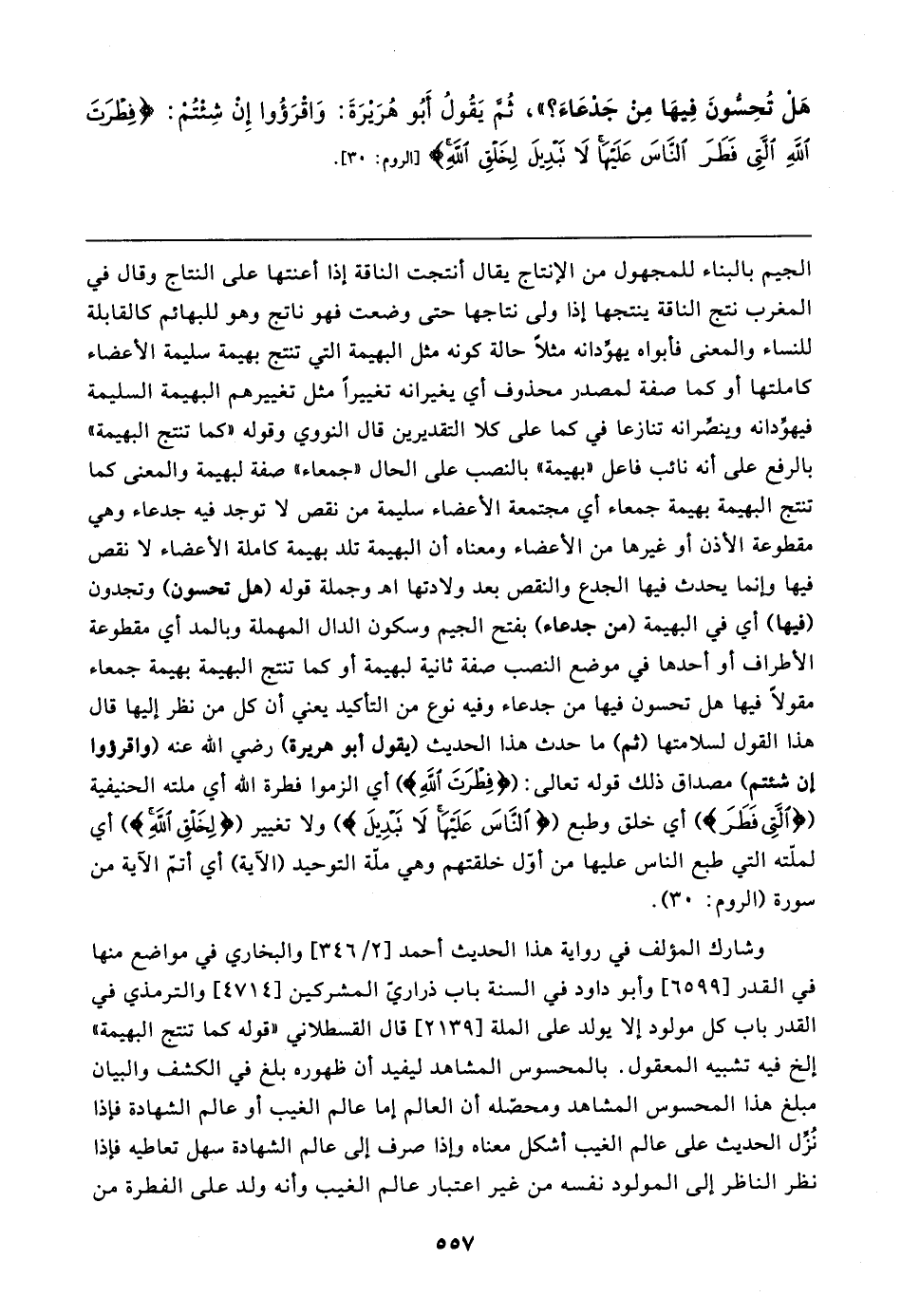 هَل تُحِسُّونَ فِيهَا من جَدعَاءَ؟ "، ثُمَّ يَقُولُ أَبُو هُرَيرَةَ: وَاقرَؤُوا إن شِئتُم: {فِطْرَتَ اللَّهِ الَّتِي فَطَرَ النَّاسَ عَلَيهَا لَا تَبْدِيلَ لِخَلْقِ اللَّهِ} [الروم: ٣٠]