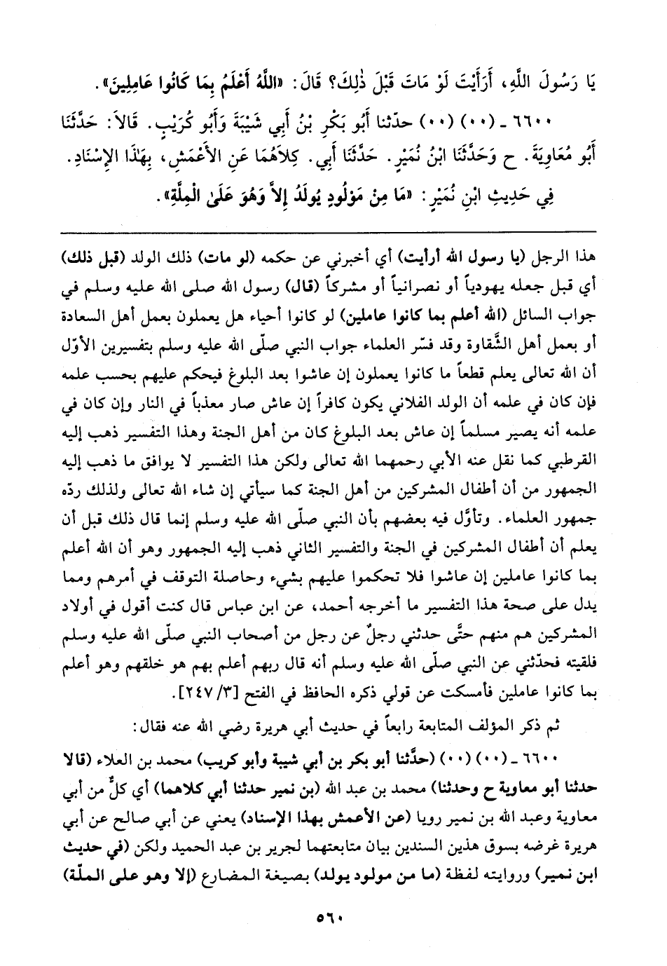 ٦٦٠٠ - (٠٠) (٠٠) (حدَّثنا أبو بكر بن أبي شيبة وأبو غريب) محمَّد بن العلاء (قالا حدثنا أبو معاوية ح وحدثنا) محمَّد بن عبد الله (بن نمير حدثنا أبي كلاهما) أي كل من أبي معاوية وعبد الله بن نمير رويا (عن الأعمش بهذا الإسناد) يعني عن أبي صالح عن أبي هريرة غرضه بسوق هذين السندين بيان متابعتهما لجرير بن عبد الحميد ولكن (في حديث ابن نمير) وروايته لفظة (ما من مولود يولد) بصيغة المضارع (إلا وهو على الملّة)
