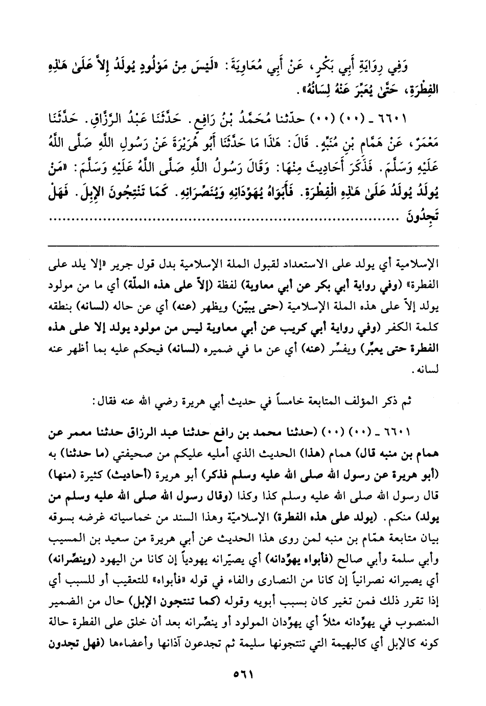 ٦٦٠١ - (٠٠) (٠٠) (حدثنا محمَّد بن رافع حدثنا عبد الرزاق حدثنا معمر عن همام بن منبه قال) همام (هذا) الحديث الذي أمليه عليكم من صحيفتي (ما حدثنا) به (أبو هريرة عن رسول الله صلى الله عليه وسلم فذكر) أبو هريرة (أحاديث) كثيرة (منها) قال رسول الله صلى الله عليه وسلم كذا وكذا (وقال رسول الله صلى الله عليه وسلم من يولد) منكم. (يولد على هذه الفطرة) الإِسلامية وهذا السند من خماسياته غرضه بسوقه بيان متابعة همّام بن منبه لمن روى هذا الحديث عن أبي هريرة من سعيد بن المسيب وأبي سلمة وأبي صالح (فأبواه يهودانه) أي يصيّرانه يهوديًّا إن كانا من اليهود (وينصرانه) أي يصيرانه نصرانيًّا إن كانا من النصارى والفاء في قوله "فأبواه" للتعقيب أو للسبب أي إذا تقرر ذلك فمن تغير كان بسبب أبويه وقوله (كما تنتجون الإبل) حال من الضمير المنصوب في يهودانه مثلًا أي يهودان المولود أو ينصًرانه بعد أن خلق على الفطرة حالة كونه كالإبل أي كالبهيمة التي تنتجونها سليمة ثم تجدعون آذانها وأعضاءها (فهل تجدون