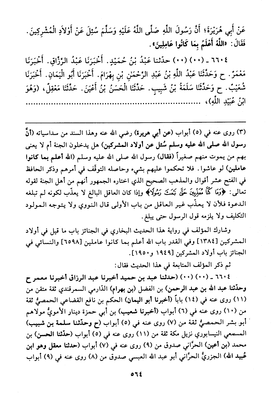 عَنْ أَبِي هُرَيرَةَ؛ أَن رَسُولَ الله صلى الله عَلَيهِ وَسلمَ سُئِلَ عَنْ أَوْلادِ المُشرِكِينَ. فَقَال: "الله أَعلَمُ بِمَا كَانُوا عَامِلِينَ".