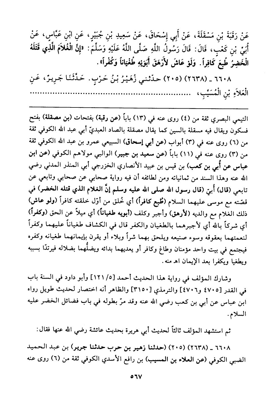 عَنْ رَقَبَةَ بْنِ مَسقَلَةَ، عَنْ أَبِي إِسْحَاقَ، عَنْ سَعِيدِ بْنِ جُبَيرٍ، عَنِ ابْنِ عَباسٍ، عَنْ أُبَي بْنِ كَعبٍ، قَال: قَال رَسُولُ الله صلى الله عَلَيهِ وَسلمَ: "إِن الغُلامَ الذِي قَتَلَهُ الخَضِرُ طُبعَ كَافِرًا. وَلَوْ عَاشَ لأَرهَقَ أَبوَيهِ طُغيَانًا وَكُفرًا".