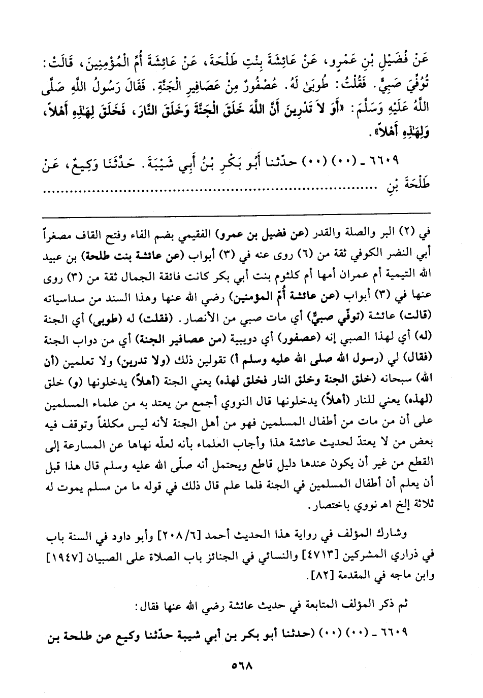 عَنْ فُضَيلِ بْنِ عَمْرٍو، عَنْ عَائِشَةَ بِنْتِ طَلحَةَ، عَنْ عَائِشَةَ أُمِّ المُؤْمِنِينَ، قَالتْ: تُوُفِّيَ صبِيٌّ. فَقُلتُ: طُوبَى لَهُ. عُصفُورٌ من عَصَافِيرِ الجَنةِ. فَقَال رَسُولُ الله صلى الله عَلَيهِ وَسلمَ: "أَوَ لَا تَدرِينَ أَن اللهَ خَلَقَ الجَنَّةَ وَخَلَقَ النَّارَ، فَخَلَقَ لِهذِهِ أَهلا، وَلِهذِهِ أَهلا".