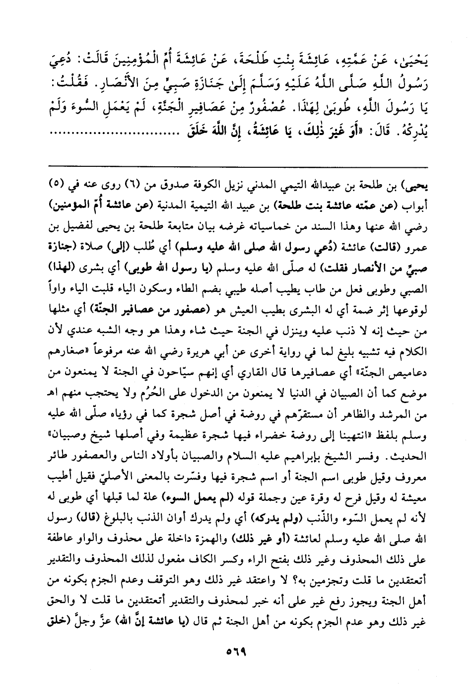 يَحْيَى، عَنْ عَمَّتِهِ، عَائِشَةَ بِنْتِ طَلحَةَ، عَنْ عَائِشَةَ أُمِّ الْمُؤْمِنِينَ قَالت: دُعِيَ رَسُولُ الله صلى الله عَلَيهِ وَسلمَ إلى جَنَازَةِ صَبِيٍّ مِنَ الأَنْصَارِ. فَقُلتُ: يَا رَسُولَ الله، طُوبَى لِهَذا. عُصْفُورٌ مِنْ عَصَافِيرِ الْجَنةِ، لَمْ يَعْمَلِ السُّوءَ وَلَمْ يُدْرِكهُ. قَال: "أَوَ غيرَ ذلِكَ، يَا عَائِشَةُ، إِن الله خَلَقَ