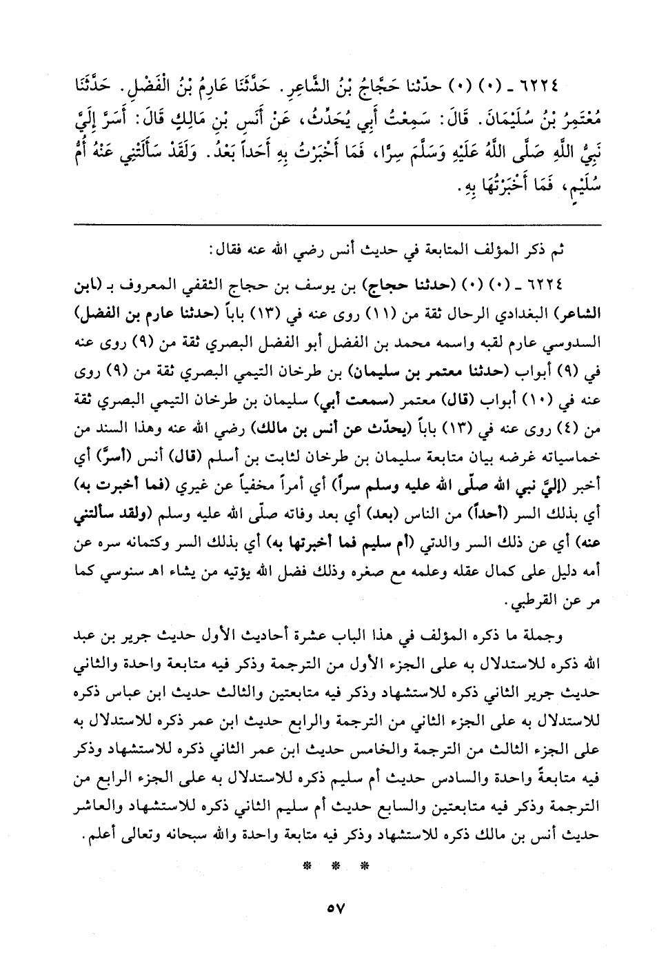 ٦٢٢٤ - (٠) (٠) (حدثنا حجاج) بن يوسف بن حجاج الثقفي المعروف بـ (ـابن الشاعر) البغدادي الرحال ثقة من (١١) روى عنه في (١٣) بابا (حدثنا عارم بن الفضل) السدوسي عارم لقبه واسمه محمد بن الفضل أبو الفضل البصري ثقة من (٩) روى عنه في (٩) أبواب (حدثنا معتمر بن سليمان) بن طرخان التيمي البصري ثقة من (٩) روى عنه في (١٠) أبواب (قال) معتمر (سمعت أبي) سليمان بن طرخان التيمي البصري ثقة من (٤) روى عنه في (١٣) بابا (يحدّث عن أنس بن مالك) رضي الله عنه وهذا السند من خماسياته غرضه بيان متابعة سليمان بن طرخان لثابت بن أسلم (قال) أنس (أسرَّ) أي أخبر (إلى نبي الله صلى الله عليه وسلم سرًّا) أي أمرًا مخفيًا عن غيري (فما أخبرت به) أي بذلك السر (أحدًا) من الناس (بعد) أي بعد وفاته صلَّى الله عليه وسلم (ولقد سألتني عنه) أي عن ذلك السر والدتي (أم سليم فما أخبرتها به) أي بذلك السر وكتمانه سره عن أمه دليل على كمال عقله وعلمه مع صغره وذلك فضل الله يؤتيه من يشاء اهـ سنوسي كما مر عن القرطبي.