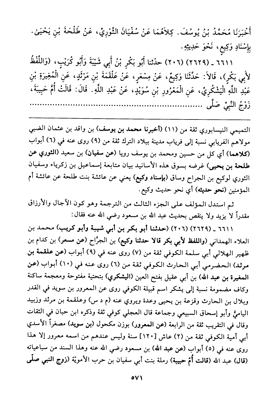 التميمي النيسابوري ثقة من (١١) (أخبرنا محمد بن يوسف) بن واقد بن عثمان الضبي مولاهم الفريابي نسبة إلى فرياب مدينة ببلاد الترك ثقة من (٩) روى عنه في (٦) أبواب كلاهما) أي كل من حسين ومحمد بن يوسف رويا (عن سفيان) بن سعيد (الثوري عن طلحة بن يحيى) غرضه بسوق هذه الأسانيد بيان متابعة إسماعيل بن زكرياء وسفيان الثوري لوكيع بن الجراح وساق (بإسناد وكيع) يعني عن عائشة بنت طلحة عن عائشة أم المؤمنين (نحو حديثه) أي نحو حديث وكيع.