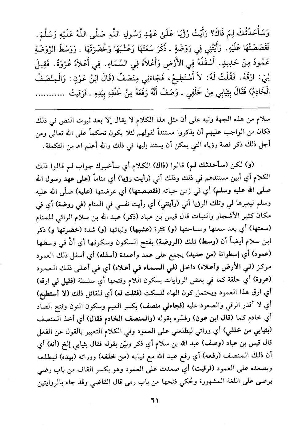 وَسَأُحَدِّثُكَ لِمَ ذَاكَ؟ رَأَيتُ رُؤْيَا عَلَى عَهْدِ رَسُولِ اللهِ صَلَّى اللهُ عَلَيهِ وَسَلَّمَ. فَقَصَصْتُهَا عَلَيهِ. رَأَيتُنِي فِي رَوْضَةٍ -ذَكَرَ سَعَتَهَا وَعُشْبَهَا وَخُضْرَتَهَا- وَوَسْطَ الرَّوْضَةِ عَمُودٌ مِنْ حَدِيدٍ. أَسْفَلُهُ فِي الأَرْضِ وَأَعْلاهُ فِي السَّمَاءِ. فِي أَعْلاهُ عُرْوَةٌ. فَقِيلَ لِيَ: ارْقَهْ. فَقُلْتُ لَهُ: لَا أَسْتَطِيعُ، فَجَاءَنِي مِنْصَفٌ (قَال ابْنُ عَوْنٍ: وَالْمِنْصَفُ الْخَادِمُ) فَقَال بِثِيَابِي مِنْ خَلْفِي -وَصَفَ أَنَّهُ رَفَعَهُ مِنْ خَلْفِهِ بِيَدِهِ- فَرَقِيتُ