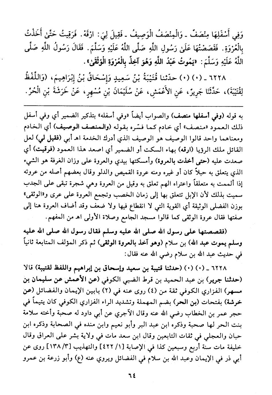 وَفِي أَسْفَلِهَا مِنْصَفٌ -وَالْمِنْصَفُ الْوَصِيفُ- فَقِيلَ لِيَ: ارْقَهْ. فَرَقِيتُ حَتَّى أَخَذْتُ بِالْعُرْوَةِ. فَقَصَصْتُهَا عَلَى رَسُولِ اللهِ صَلَّى اللهُ عَلَيهِ وَسَلَّمَ. فَقَال رَسُولُ اللهِ صَلَّى اللهُ عَلَيهِ وَسَلَّمَ: "يَمُوتُ عَبدُ اللهِ وَهُوَ آخِذٌ بِالْعُرْوَةِ الْوُثْقَى".