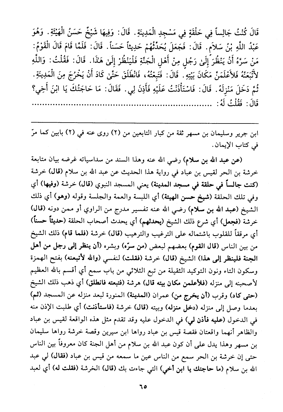 قَال كُنْتُ جَالِسًا فِي حَلْقَةٍ فِي مَسْجِدِ الْمَدِينَةِ. قَال: وَفِيهَا شَيخٌ حَسَنُ الْهَيئَةِ. وَهُوَ عَبْدُ اللهِ بْنُ سَلامٍ. قَال: فَجَعَلَ يُحَدِّثُهُمْ حَدِيثًا حَسَنًا. قَال: فَلَمَّا قَامَ قَال الْقَوْمُ: مَنْ سَرَّهُ أَنْ يَنْظُرَ إِلَى رَجُلٍ مِنْ أَهْلِ الْجَنَّةِ فَلْيَنْظُرْ إِلَى هَذَا. قَال: فَقُلْتُ: وَاللهِ لأَتْبَعَنَّهُ فَلأَعْلَمَنَّ مَكَانَ بَيتِهِ. قَال: فَتَبِعْتُهُ، فَانْطَلَقَ حَتَّى كَادَ أَنْ يَخْرُجَ مِنَ الْمَدِينَةِ. ثُمَّ دَخَلَ مَنْزِلَهُ. قَال: فَاسْتَأْذَنْتُ عَلَيهِ فَأَذِنَ لِي. فَقَال: مَا حَاجَتُكَ يَا ابْنَ أَخِي؟ قَال: فَقُلْتُ لَهُ: