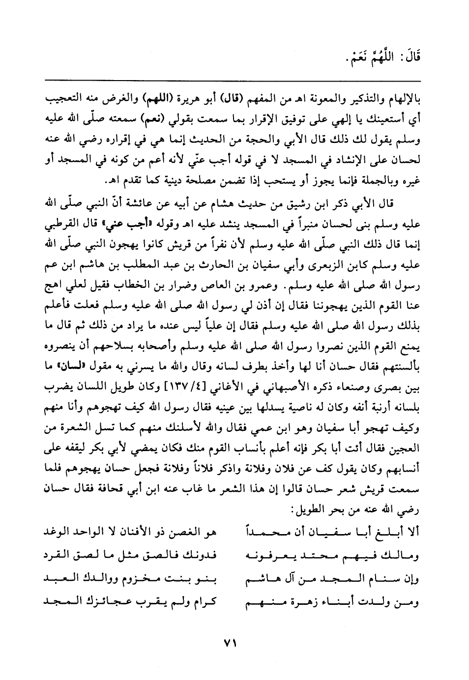 قال الأبي ذكر ابن رشيق من حديث هشام عن أبيه عن عائشة أن النبي صلَّى الله عليه وسلم بنى لحسان منبرًا في المسجد ينشد عليه اهـ وقوله "أجب عني" قال القرطبي إنما قال ذلك النبي صلَّى الله عليه وسلم لأن نفرًا من قريش كانوا يهجون النبي صلَّى الله عليه وسلم كابن الزبعرى وأبي سفيان بن الحارث بن عبد المطلب بن هاشم ابن عم رسول الله صلى الله عليه وسلم. وعمرو بن العاص وضرار بن الخطاب فقيل لعلي اهج عنا القوم الذين يهجوننا فقال إن أذن لي رسول الله صلى الله عليه وسلم فعلت فأعلم بذلك رسول الله صلى الله عليه وسلم فقال إن عليًّا ليس عنده ما يراد من ذلك ثم قال ما يمنع القوم الذين نصروا رسول الله صلى الله عليه وسلم وأصحابه بسلاحهم أن ينصروه بألسنتهم فقال حسان أنا لها وأخذ بطرف لسانه وقال والله ما يسرني به مقول "لسان" ما بين بصرى وصنعاء ذكره الأصبهاني في الأغاني [٤/ ١٣٧] وكان طويل اللسان يضرب بلسانه أرنبة أنفه وكان له ناصية يسدلها بين عينيه فقال رسول الله كيف تهجوهم وأنا منهم وكيف تهجو أبا سفيان وهو ابن عمي فقال والله لأسلنك منهم كما تسل الشعرة من العجين فقال أئت أبا بكر فإنه أعلم بأنساب القوم منك فكان يمضي لأبي بكر ليقفه على أنسابهم وكان يقول كف عن فلان وفلانة واذكر فلانًا وفلانة فجعل حسان يهجوهم فلما سمعت قريش شعر حسان قالوا إن هذا الشعر ما غاب عنه ابن أبي قحافة فقال حسان رضي الله عنه من بحر الطويل: