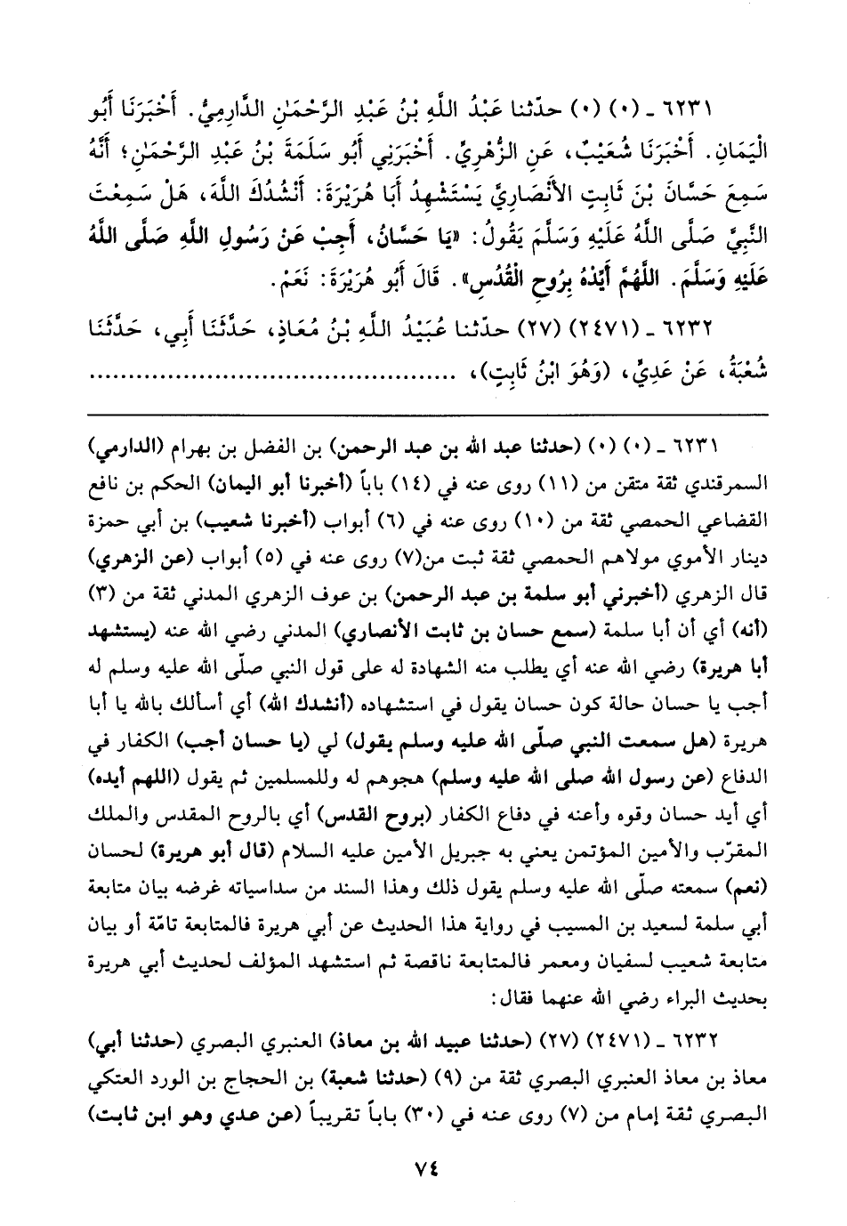 ٦٢٣١ - (٠) (٠) حدَّثنا عَبْدُ اللهِ بْنُ عَبْدِ الرَّحمَنِ الدَّارِمِيُّ. أَخبَرَنَا أَبُو الْيَمَانِ. أَخْبَرَنَا شُعَيبٌ، عَنِ الزُّهْرِيِّ. أَخبَرَنِي أَبُو سَلَمَةَ بْنُ عَبْدِ الرَّحمَنِ؛ أَنَّهُ سَمِعَ حَسَّانَ بْنَ ثَابِتٍ الأَنْصَارِيَّ يَسْتَشهِدُ أَبَا هُرَيرَةَ: أَنْشُدُكَ اللهَ، هَل سَمِعْتَ النَّبِيَّ صَلَّى اللهُ عَلَيهِ وَسَلَّمَ يَقُولُ: "يَا حَسَّانُ، أَجِبْ عَنْ رَسُولِ اللهِ صَلَّى اللهُ عَلَيهِ وَسَلَّمَ. اللَّهُمَّ أَيِّدْهُ بِرُوحِ الْقُدُسِ". قَال أَبُو هُرَيرَةَ: نَعَمْ.