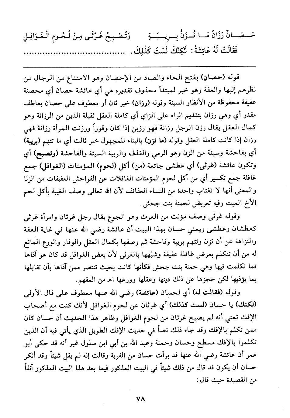 قوله (حصان) بفتح الحاء والصاد من الإحصان وهو الامتناع من الرجال من نظرهم إليها والعفة وهو خبر لمبتدأ محذوف تقديره هي أي عائشة حصان أي محصنة عفيفة محفوظة من الأنظار السيئة وقوله (رزان) خبر ثان أو معطوف على حصان بعاطف مقدر أي وهي رزان بتقديم الراء على الزاي أي كاملة العقل ثقيلة الدين من الرزانة وهو كمال العقل يقال رزن الرجل رزانة فهو رزين إذا كان وقورًا ورزنت المرأة رزانة فهي رزان إذا كانت كاملة العقل وقوله (ما تزن) بالبناء للمجهول خبر ثالث أي ما تتهم (بريبة) أي بفاحشة وسيئة من الزن وهو الرمي والقذف والريبة السيئة والفاحشة (وتصبح) أي وتكون عائشة (غرثى) أي عطشى جائعة (من) أكل (لحوم) المؤمنات (الغوافل) جمع غافلة جمع تكسير أي من أكل لحوم المؤمنات الغافلات عن الفواحش العفيفات من الزنا والمعنى أنها لا تغتاب واحدة من النساء العفائف لأن الله تعالى وصف الغيبة بأكل لحم الأخ الميت وفيه تعريض لحمنة بنت جحش.