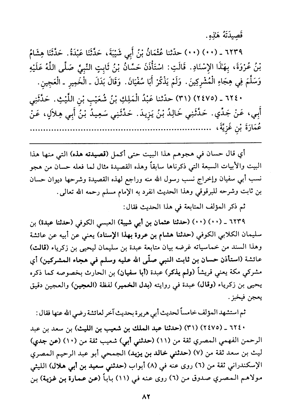 ٦٢٣٩ - (٠٠) (٠٠) حدَّثنا عُثْمَانُ بْنُ أَبِي شَيبَةَ، حَدَّثَنَا عَبْدَةُ. حَدَّثَنَا هِشَامُ بْنُ عُرْوَةَ، بِهَذا الإِسْنَادِ. قَالتِ: اسْتَأذَنَ حَسَّانُ بْنُ ثَابِتٍ النَّبِيَّ صَلَّى اللهُ عَلَيهِ وَسَلَّمَ فِي هِجَاءِ الْمُشرِكِينَ. وَلَمْ يَذْكُرْ أَبَا سُفْيَانَ. وَقَال بَدَلَ -الْخَمِيرِ- الْعَجِينِ.
