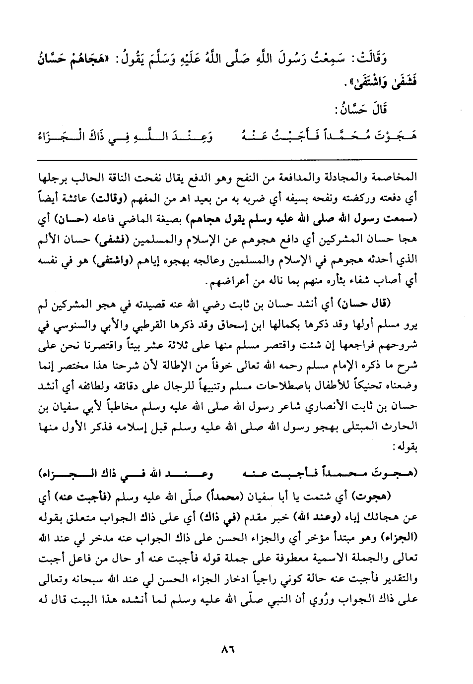 وَقَالتْ: سَمِعْتُ رَسُولَ اللهِ صَلَّى اللهُ عَلَيهِ وَسَلَّمَ يَقُولُ: "هَجَاهُم حَسَّانُ فَشَفَى وَاشتَفَى".