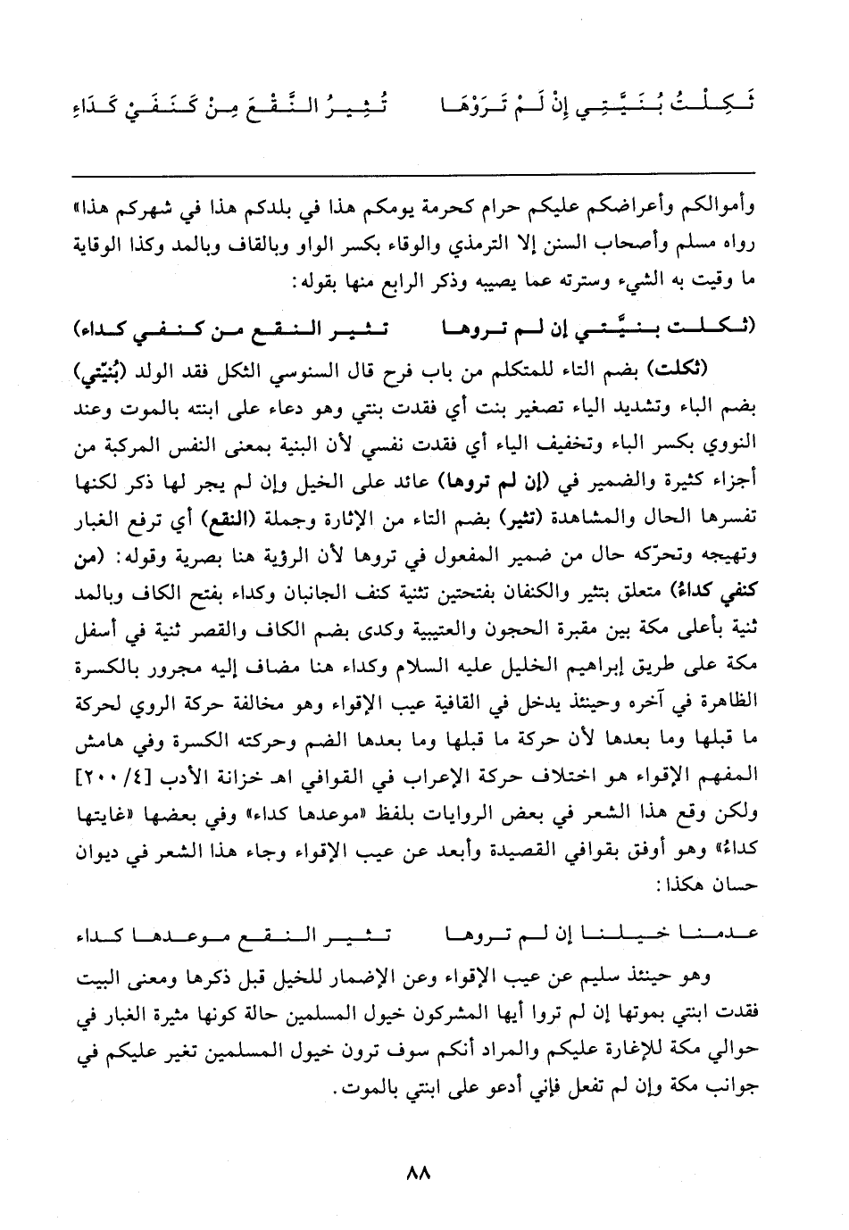(ثكلت) بضم التاء للمتكلم من باب فرح قال السنوسي الثكل فقد الولد (بُنيَّتي) بضم الباء وتشديد الياء تصغير بنت أي فقدت بنتي وهو دعاء على ابنته بالموت وعند النووي بكسر الباء وتخفيف الياء أي فقدت نفسي لأن البنية بمعنى النفس المركبة من أجزاء كثيرة والضمير في (إن لم تروها) عائد على الخيل وإن لم يجر لها ذكر لكنها تفسرها الحال والمشاهدة (تثير) بضم التاء من الإثارة وجملة (النقع) أي ترفع الغبار وتهيجه وتحرّكه حال من ضمير المفعول في تروها لأن الرؤية هنا بصرية وقوله: (من كنفي كداءُ) متعلق بتثير والكنفان بفتحتين تثنية كنف الجانبان وكداء بفتح الكاف وبالمد ثنية بأعلى مكة بين مقبرة الحجون والعتيبية وكدى بضم الكاف والقصر ثنية في أسفل مكة على طريق إبراهيم الخليل - عليه السلام - وكداء هنا مضاف إليه مجرور بالكسرة الظاهرة في آخره وحينئذ يدخل في القافية عيب الإقواء وهو مخالفة حركة الروي لحركة ما قبلها وما بعدها لأن حركة ما قبلها وما بعدها الضم وحركته الكسرة وفي هامش المفهم الإقواء هو اختلاف حركة الإعراب في القوافي اهـ خزانة الأدب [٤/ ٢٠٠] ولكن وقع هذا الشعر في بعض الروايات بلفظ "موعدها كداء" وفي بعضها "غايتها كداءُ" وهو أوفق بقوافي القصيدة وأبعد عن عيب الإقواء وجاء هذا الشعر في ديوان حسان هكذا: