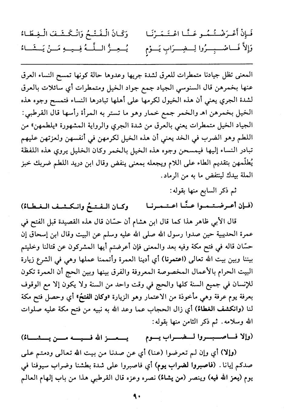 قال الأبي ظاهر هذا كما قال ابن هشام أن حسَّان قال هذه القصيدة قبل الفتح في عمرة الحديبية حين صدوا رسول الله صلى الله عليه وسلم عن البيت وقال ابن إسحاق إن حسّان قاله في فتح مكة وفيه بعد والمعنى فإن أعرضتم أيها المشركون عن قتالنا وخليتم بيننا وبين بيت الله تعالى (اعتمرنا) أي أدينا العمرة وأتممنا عملها وهي في الشرع زيارة البيت الحرام بالأعمال المخصوصة المعروفة والفرق بينها وبين الحج أن العمرة تكون للإنسان في جميع السنة كلها والحج في وقت واحد من السنة ولا يكون إلا مع الوقوف بعرفة يوم عرفة وهي مأخوذة من الاعتمار وهو الزيارة "وكان الفتحُ" أي وحصل فتح مكة لنا (وانكشف الغطاءُ) أي زال الحجاب عما وعد الله به نبيه من فتح مكة عليه صلوات الله وسلامه. ثم ذكر الثامن منها بقوله: