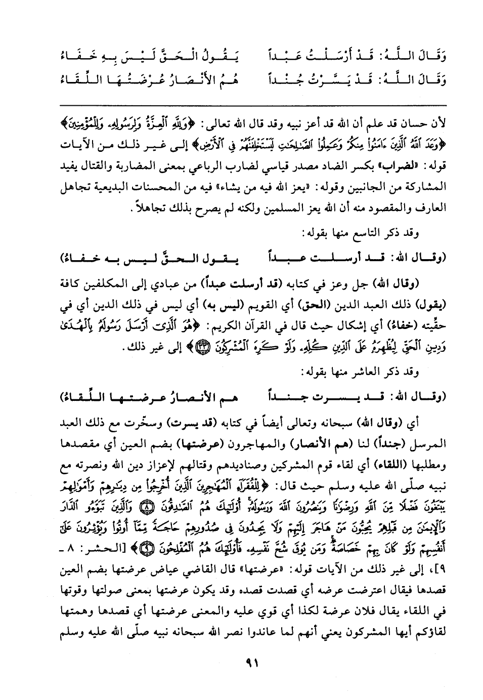 (وقال الله) جل وعز في كتابه (قد أرسلت عبدًا) من عبادي إلى المكلفين كافة (يقول) ذلك العبد الدين (الحق) أي القويم (ليس به) أي ليس في ذلك الدين أي في حقيته (خفاءُ) أي إشكال حيث قال في القرآن الكريم: {هُوَ الَّذِي أَرْسَلَ رَسُولَهُ بِالْهُدَى وَدِينِ الْحَقِّ لِيُظْهِرَهُ عَلَى الدِّينِ كُلِّهِ وَلَوْ كَرِهَ الْمُشْرِكُونَ (٣٣)} إلى غير ذلك.
