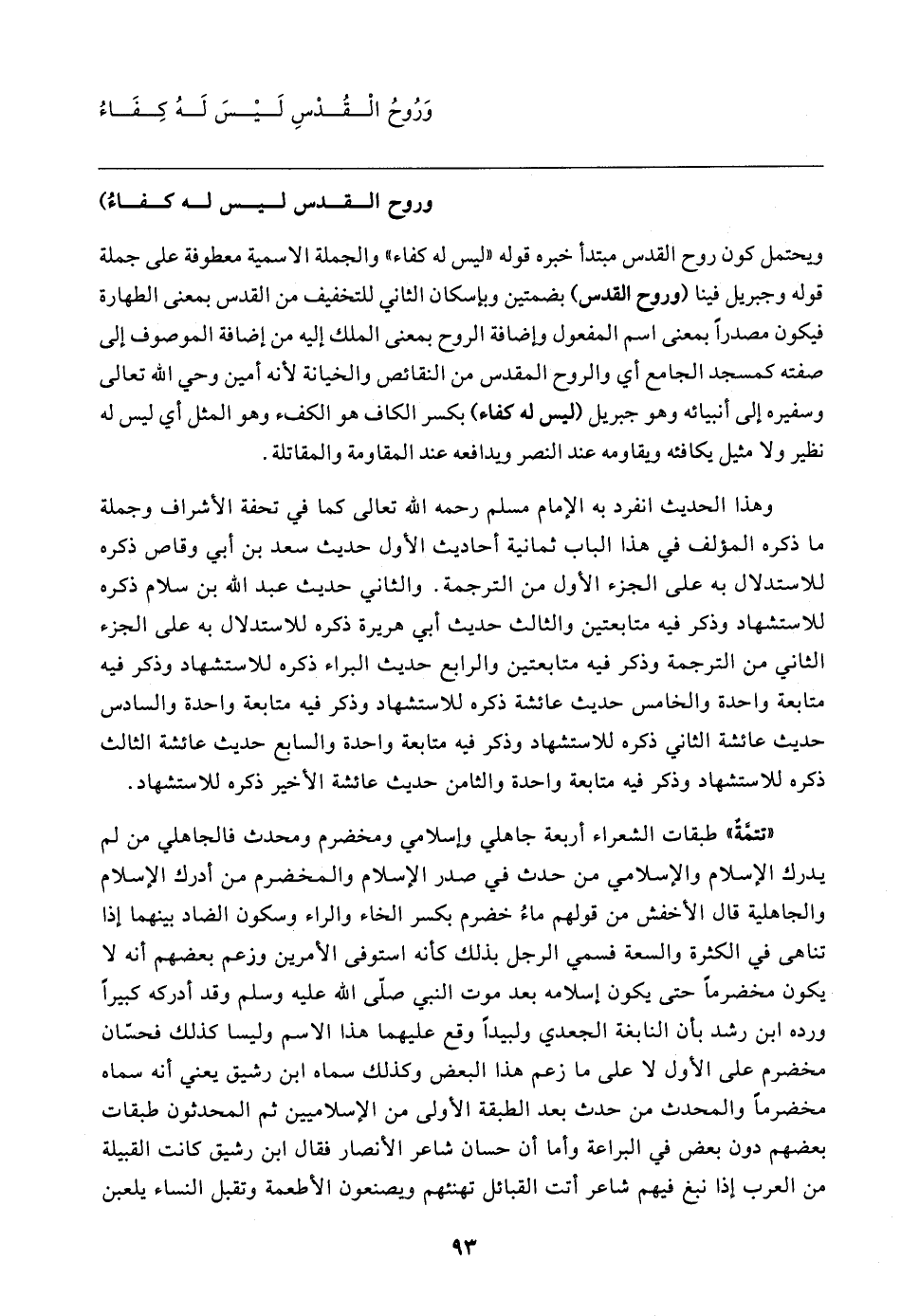 ويحتمل كون روح القدس مبتدأ خبره قوله "ليس له كفاء" والجملة الاسمية معطوفة على جملة قوله وجبريل فينا (وروح القدس) بضمتين وبإسكان الثاني للتخفيف من القدس بمعنى الطهارة فيكون مصدرًا بمعنى اسم المفعول وإضافة الروح بمعنى الملك إليه من إضافة الموصوف إلى صفته كمسجد الجامع أي والروح المقدس من النقائص والخيانة لأنه أمين وحي الله تعالى وسفيره إلى أنبيائه وهو جبريل (ليس له كفاء) بكسر الكاف هو الكفء وهو المثل أي ليس له نظير ولا مثيل يكافئه ويقاومه عند النصر ويدافعه عند المقاومة والمقاتلة.