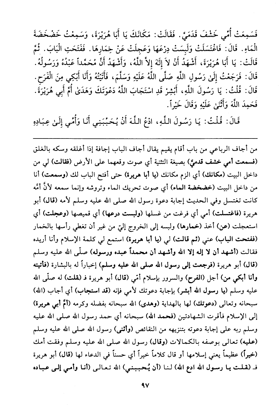فَسَمِعَتْ أُمِّي خَشْفَ قَدَمَيَّ. فَقَالتْ: مَكَانَكَ يَا أَبَا هُرَيرَةَ، وَسَمِعْتُ خَضْخَضَةَ الْمَاءِ. قَال: فَاغْتَسَلَتْ وَلَبِسَت دِرْعَهَا وَعَجِلَتْ عَنْ خِمَارِهَا. فَفَتَحَتِ الْبَابَ. ثُمَّ قَالتْ: يَا أَبَا هُرَيرَةَ، أَشْهَدُ أَنْ لَا إِلَهَ إلا اللهُ، وَأَشْهَدُ أَن مُحَمَّدًا عَبْدُهُ وَرَسُولُهُ. قَال: فَرَجَعْتُ إِلَى رَسُولِ اللهِ صَلَّى اللهُ عَلَيهِ وَسَلَّمَ، فَأَتَيتُهُ وَأَنَا أَبْكِي مِنَ الْفَرَحِ. قَال: قُلْتُ: يَا رَسُولَ اللهِ، أَبْشِرْ قَدِ اسْتَجَابَ اللهُ دَعْوَتَكَ وَهَدَى أُمَّ أَبِي هُرَيرَةَ. فَحَمِدَ اللهَ وَأَثْنَى عَلَيهِ وَقَال خَيرًا.