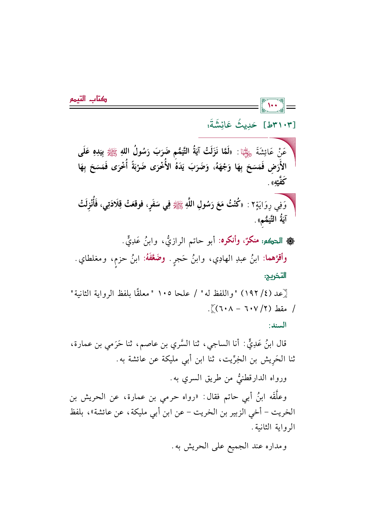 قال ابنُ عَدِيٍّ: أنا الساجي، ثنا السَّري بن عاصم، ثنا حَرَمي بن عمارة، ثنا الحَرِيش بن الخِرِّيت، ثنا ابن أبي مليكة عن عائشة به.