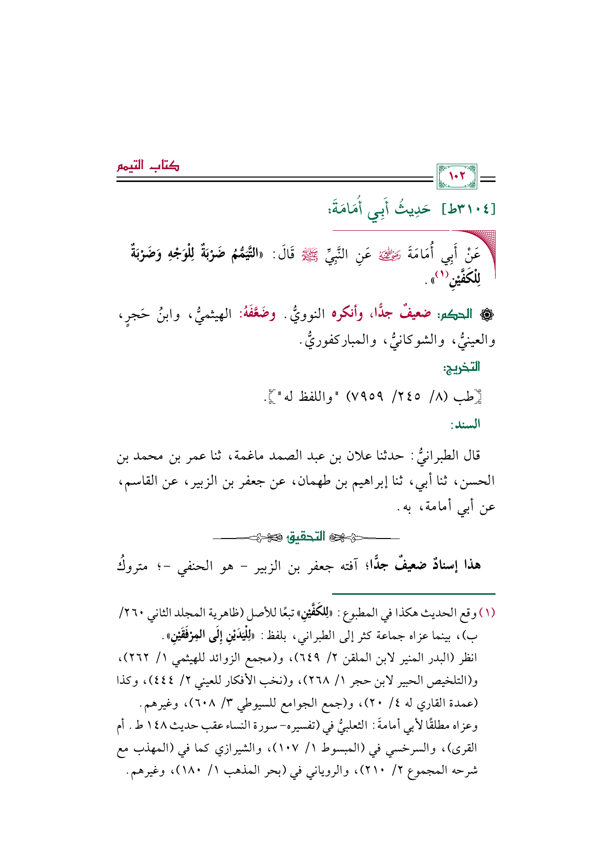 (¬١) وقع الحديث هكذا في المطبوع: «لِلكَفَّيْنِ» تبعًا للأصل (ظاهرية المجلد الثاني ٢٦٠/ ب)، بينما عزاه جماعة كثر إلى الطبراني، بلفظ: «لِلْيَدَيْنِ إِلَى المِرْفَقَيْنِ».