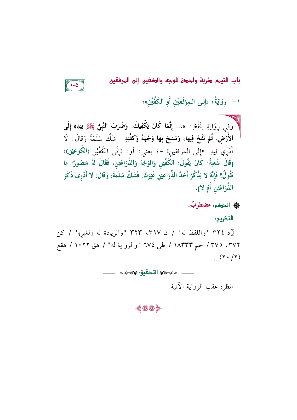 ◼ وَفِي رِوَايَةٍ بِلَفْظِ: (( ... إِنَّمَا كَانَ يَكْفِيكَ. وَضَرَبَ النَّبِيُّ صلى الله عليه وسلم بِيَدِهِ إِلَى الأَرْضِ، ثُمَّ نَفَخَ فِيهَا، وَمَسَحَ بِهَا وَجْهَهُ وَكَفَّيْهِ -شَكَّ سَلَمَةُ وَقَالَ: لَا أَدْرِي فِيهِ: ((إِلَى المرفقينِ)) -؛ يعني: أو: ((إِلَى الكَفَّيْنِ (الكُوعَيْنِ))) [قَالَ شُعبَةُ: كَانَ يَقُولُ: الكَفَّيْنِ وَالوَجْهَ وَالذِّرَاعَيْنِ، فَقَالَ لَهُ مَنصُورٌ: مَا تَقُولُ؟ فَإِنَّهُ لا يَذْكُرُ أَحَدٌ الذِّرَاعَيْنِ غَيْرُكَ. فَشَكَّ سَلَمَةُ، وَقَالَ: لا أَدْرِي ذَكَرَ الذِّرَاعَيْنِ أَمْ لَا].
