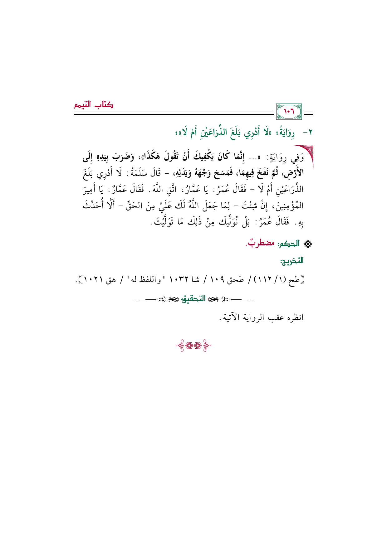 • وَفِي رِوَايَةٍ: (( ... إِنَّمَا كَانَ يَكْفِيكَ أَنْ تَقُولَ هَكَذَا))، وَضَرَبَ بِيَدِهِ إِلَى الأَرْضِ، ثُمَّ نَفَخَ فِيهِمَا، فَمَسَحَ وَجْهَهُ وَيَدَيْهِ، -قَالَ سَلَمَةُ: لَا أَدْرِي بَلَغَ الذِّرَاعَيْنِ أَمْ لَا- فَقَالَ عُمَرُ: يَا عَمَّارُ، اتَّقِ اللَّهَ. فَقَالَ عَمَّارٌ: يَا أَمِيرَ المُؤْمِنِينَ، إِنْ شِئْتَ -لِمَا جَعَلَ اللَّهُ لَكَ عَلَيَّ مِنَ الحَقِّ- أَلَّا أُحَدِّثَ بِهِ. فَقَالَ عُمَرُ: بَلْ نُوَلِّيكَ مِنْ ذَلِكَ مَا تَوَلَّيْتَ.