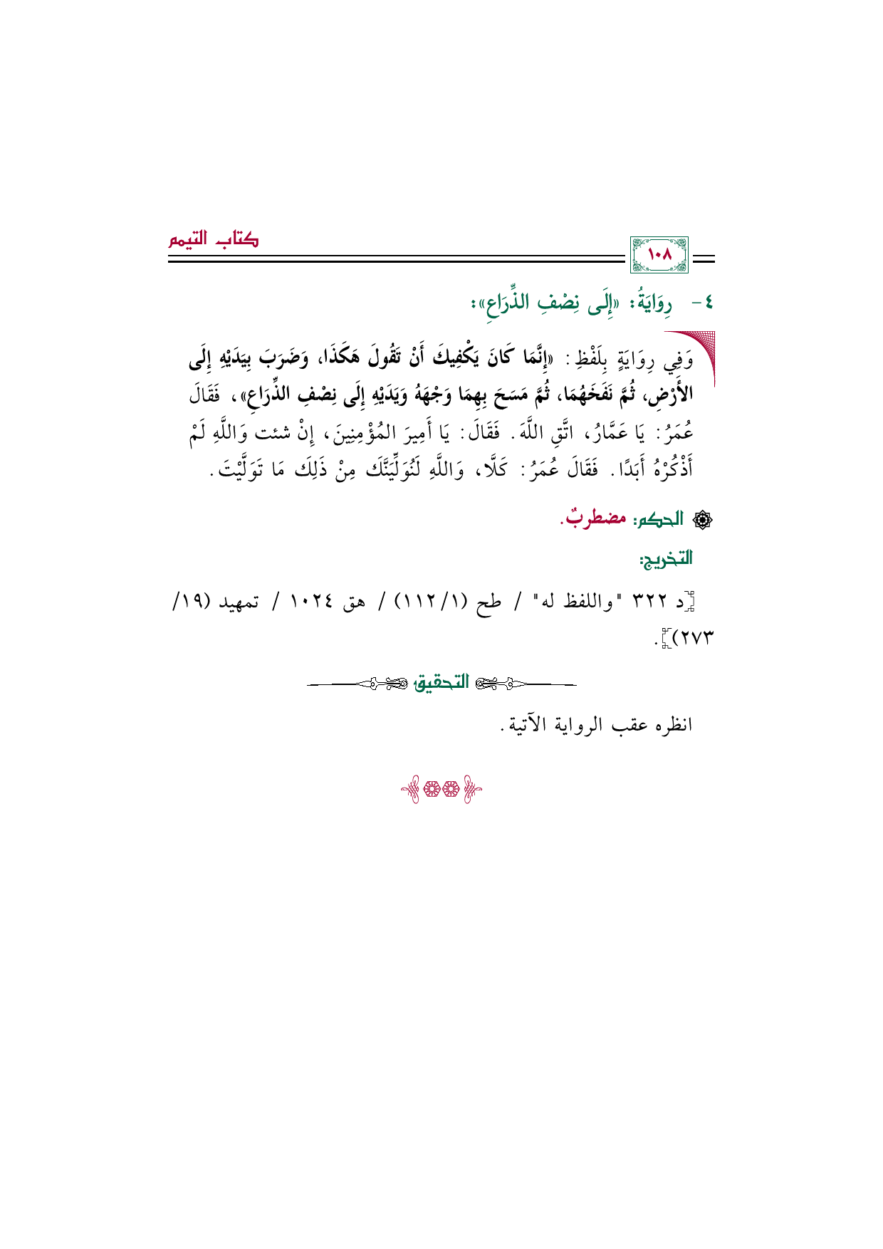 • وَفِي رِوَايَةٍ بِلَفْظِ: ((إِنَّمَا كَانَ يَكْفِيكَ أَنْ تَقُولَ هَكَذَا، وَضَرَبَ بِيَدَيْهِ إِلَى الأَرْضِ، ثُمَّ نَفَخَهُمَا، ثُمَّ مَسَحَ بِهِمَا وَجْهَهُ وَيَدَيْهِ إِلَى نِصْفِ الذِّرَاعِ))، فَقَالَ عُمَرُ: يَا عَمَّارُ، اتَّقِ اللَّهَ. فَقَالَ: يَا أَمِيرَ المُؤْمِنِينَ، إِنْ شئت وَاللَّهِ لَمْ أَذْكُرْهُ أَبَدًا. فَقَالَ عُمَرُ: كَلَّا، وَاللَّهِ لَنُوَلِّيَنَّكَ مِنْ ذَلِكَ مَا تَوَلَّيْتَ.