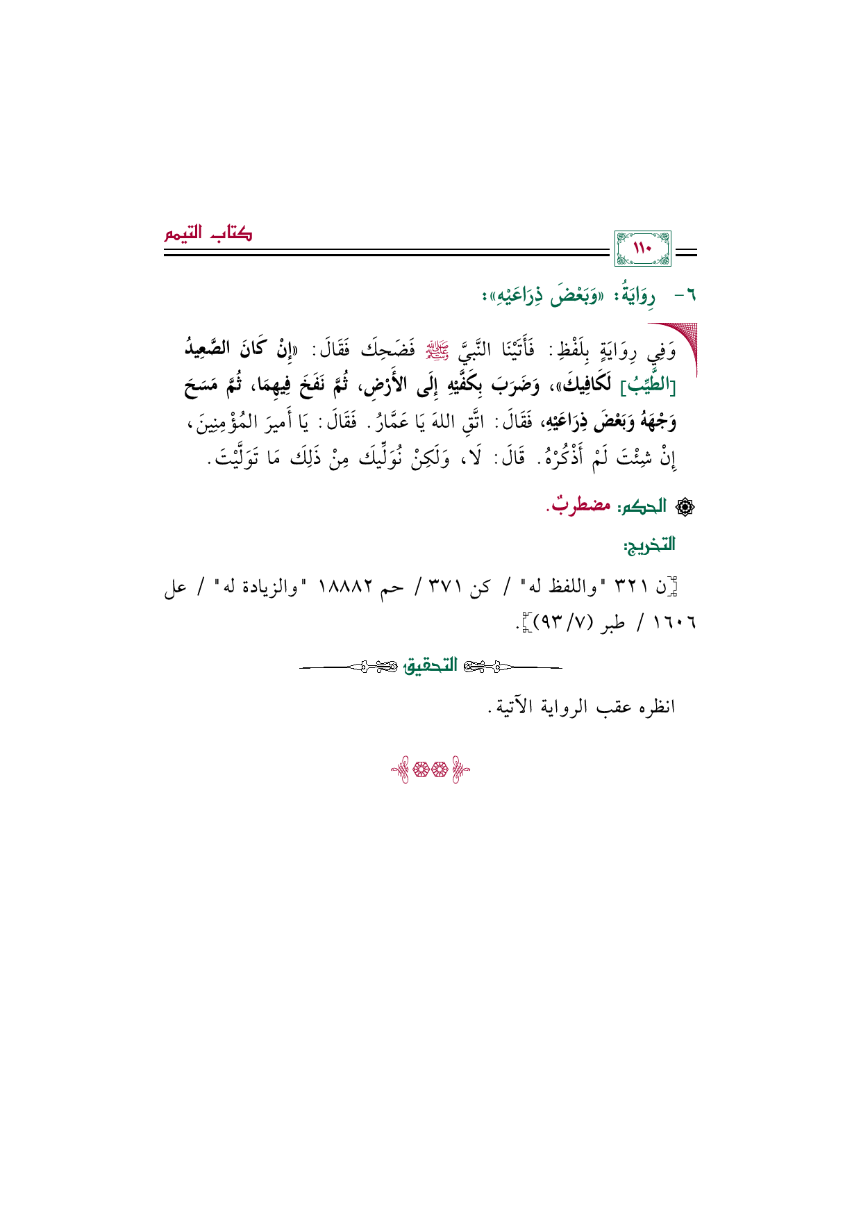 • وَفِي رِوَايَةٍ بِلَفْظِ: فَأَتَيْنَا النَّبيَّ صلى الله عليه وسلم فَضَحِكَ فَقَالَ: ((إِنْ كَانَ الصَّعِيدُ [الطَّيِّبُ] لَكَافِيكَ))، وَضَرَبَ بِكَفَّيْهِ إِلَى الأَرْضِ، ثُمَّ نَفَخَ فِيهِمَا، ثُمَّ مَسَحَ وَجْهَهُ وَبَعْضَ ذِرَاعَيْهِ، فَقَالَ: اتَّقِ اللهَ يَا عَمَّارُ. فَقَالَ: يَا أَميرَ المُؤْمِنِينَ، إِنْ شِئْتَ لَمْ أَذْكُرْهُ. قَالَ: لَا، وَلَكِنْ نُوَلِّيكَ مِنْ ذَلِكَ مَا تَوَلَّيْتَ.
