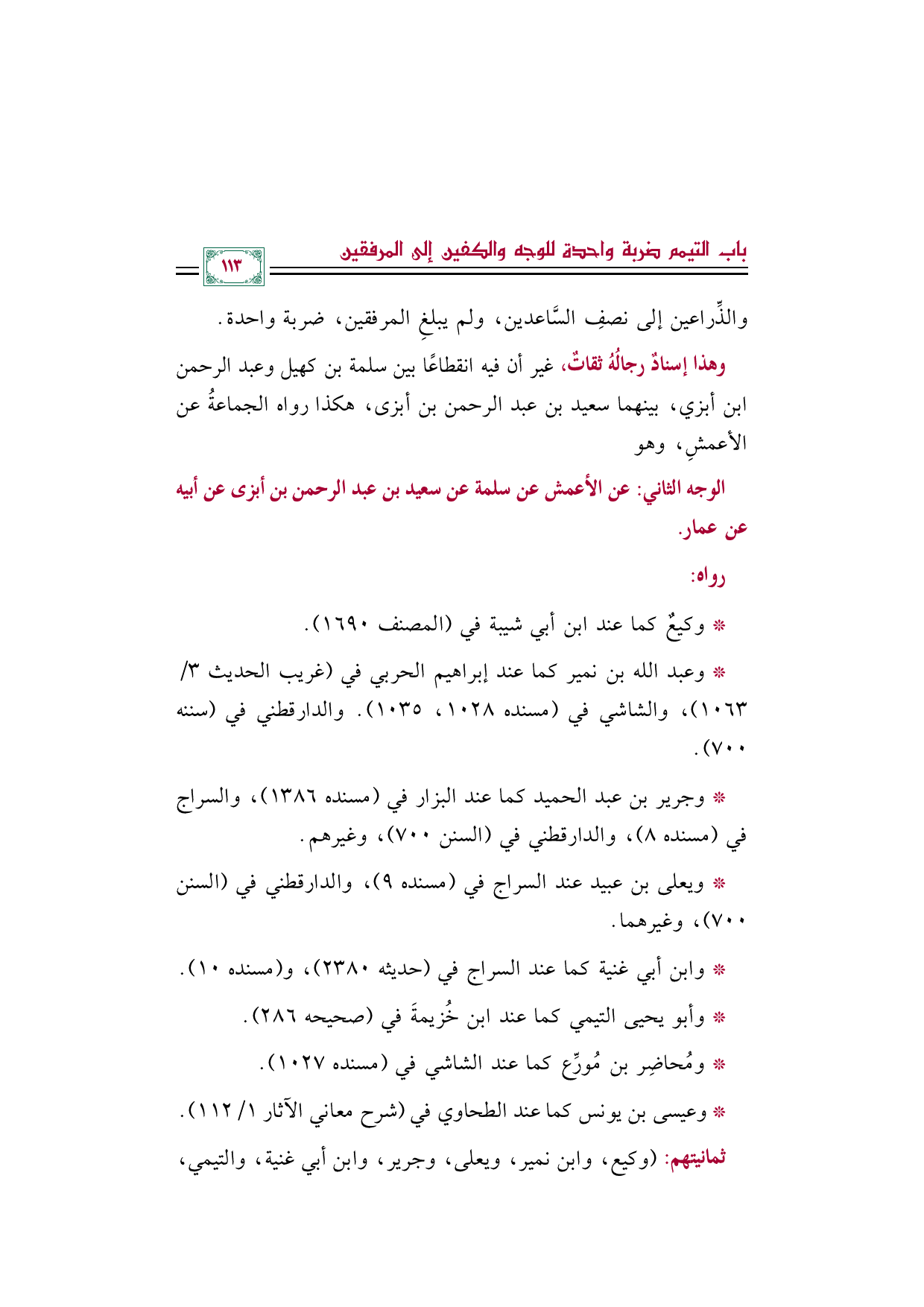 الوجه الثاني: عن الأعمش عن سلمة عن سعيد بن عبد الرحمن بن أبزى عن أبيه عن عمار.
