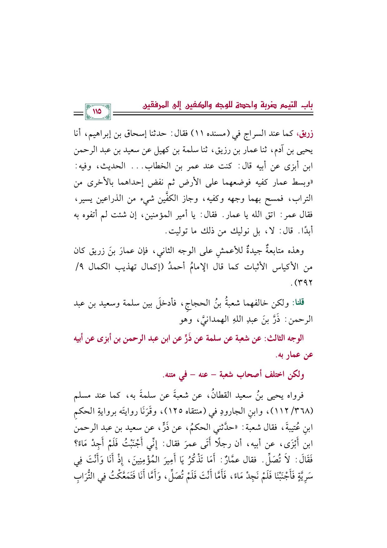 زريق، كما عند السراج في (مسنده ١١) فقال: حدثنا إسحاق بن إبراهيم، أنا يحيى بن آدم، ثنا عمار بن رزيق، ثنا سلمة بن كهيل عن سعيد بن عبد الرحمن بن أبزى عن أبيه قال: كنت عند عمر بن الخطاب ... الحديث، وفيه: "وبسط عمار كفيه فوضعهما على الأرض ثم نفض إحداهما بالأخرى من التراب، فمسح بهما وجهه وكفيه، وجاز الكفَّين شيء من الذراعين يسير، فقال عمر: اتق الله يا عمار. فقال: يا أمير المؤمنين، إن شئت لم أتفوه به أبدًا. قال: لا، بل نوليك من ذلك ما توليت.